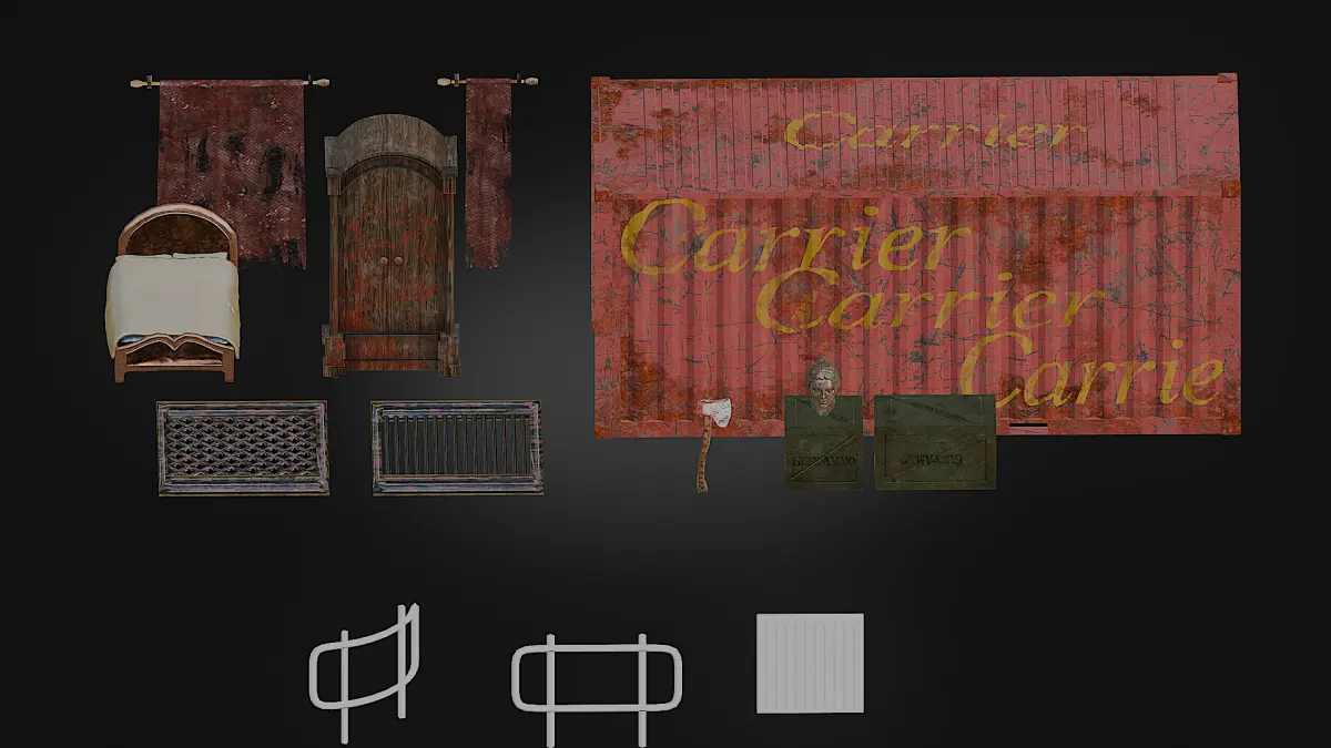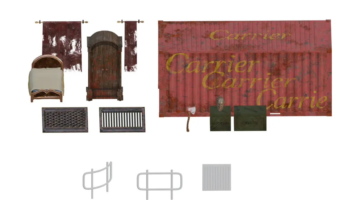 This 3D model collection features a rugged industrial container with Carrier Cargo branding, paired with rustic bedroom furniture (bed, wardrobe, curtains), ammo crates, an axe, and a modular fence. Ideal for game development, architectural visualization, or cinematic scenes requiring a blend of industrial and vintage elements. High-quality, detailed assets with a weathered texture.Models3D modelContainerFurnitureBedroomAmmo crateAxeFenceRusticIndustrialGame assetwhole scene stats:Obiekty: 19 (Vertices): 19,744 (Edges): 38,760(Faces): 19,011(Triangles): 38,139