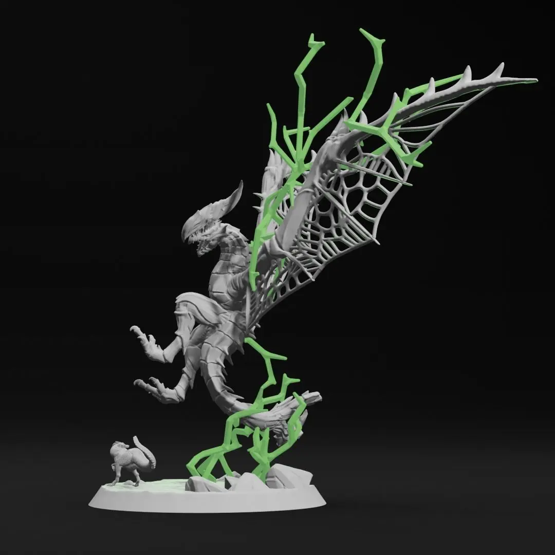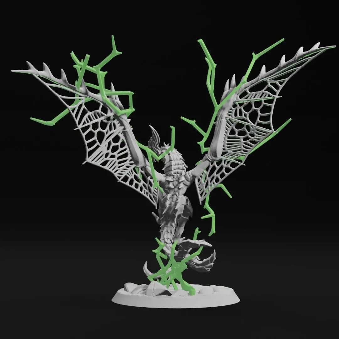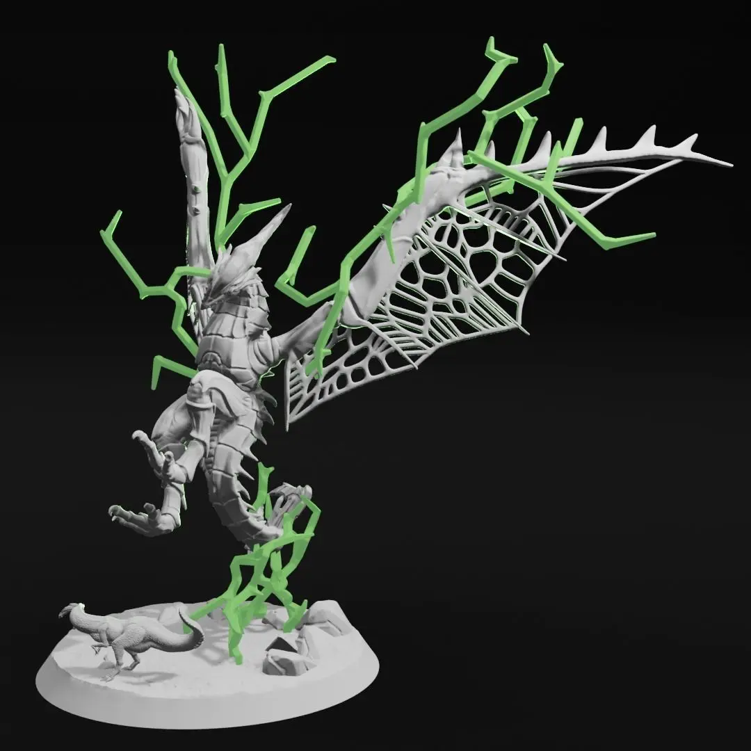 The flight diorama comes in a total of 10 files. The astalos comes in both whole and parts for easier printing. Lightning effects simply sit on each wing, with the base lightning slotting into the astalos' tail and base to prop up the model. Glue jaggia wherever you'd like on the 3" base provided.