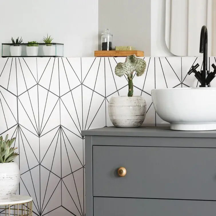 - Blending subtle and clean lines, our Misha Hex Blanco 8-5/8x 9-7/8 Porcelain Floor and Wall Tile offers geometric minimalism reminiscent of mid-century modern design. This hexagon shaped tile transforms any space into a work of art through linear starburst patterns that when laid out, intertwine to create captivating designs. Set on a smooth, satin base glaze, this porcelain tile features a snow white colour tone accented by charcoal black lines that extend across the surface. This trendsetting display of geometric pattern is visually appealing and versatile, and can be laid out in various different patterns to create a one-of-a-kind installation. Its impervious and frost-resistant features make this an ideal choice for indoor and outdoor installations, including backsplashes, kitchens, bathrooms, showers, entryways and patios. This tile is a perfect choice on its own or paired with other products in the Aster Collection. Tile is the better choice for your space. This tile is made from natural ingredients, making it a healthy choice as it is free from allergens, VOCs, formaldehyde and PVC.