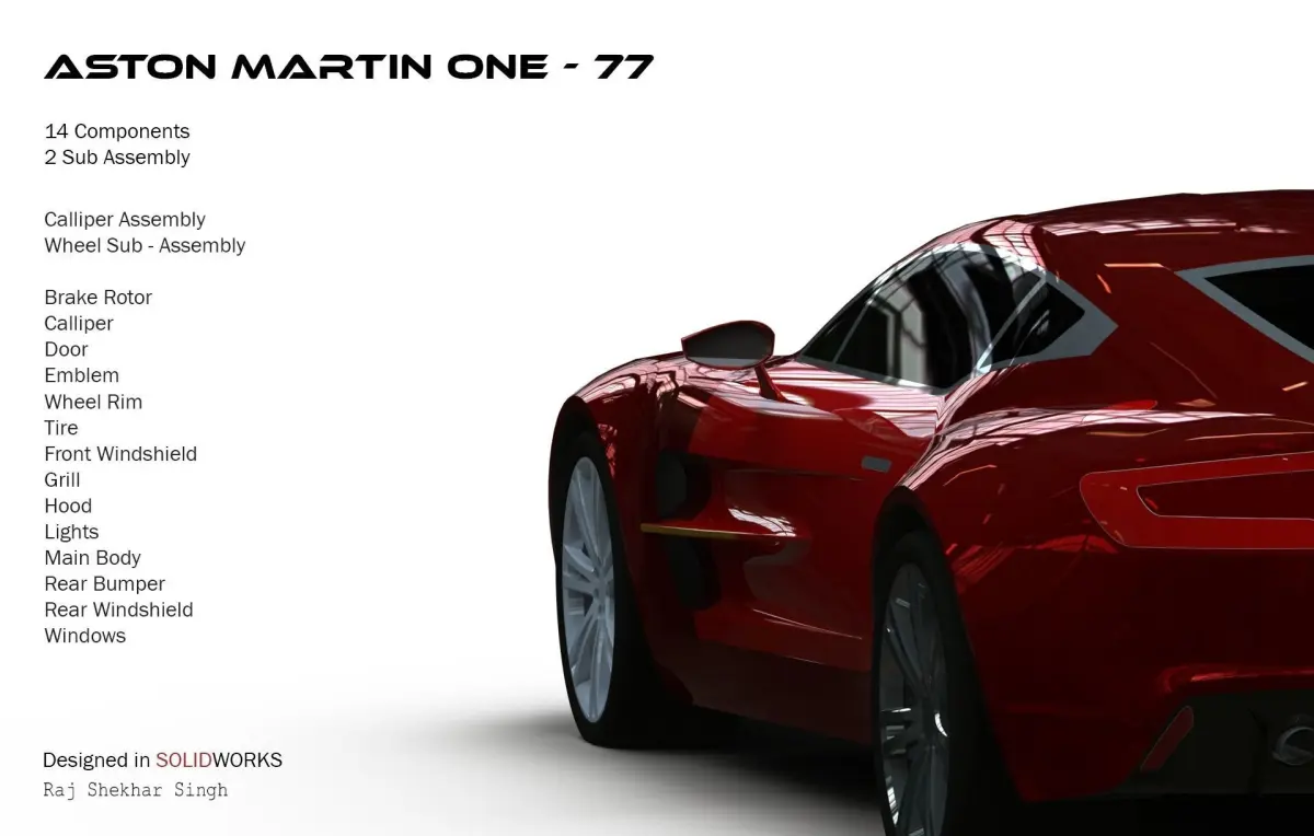 This is a Solidworks model of Aston Martin. It contains all the part files and final assembly. It contains color and material also that are applied to various parts of the model.
