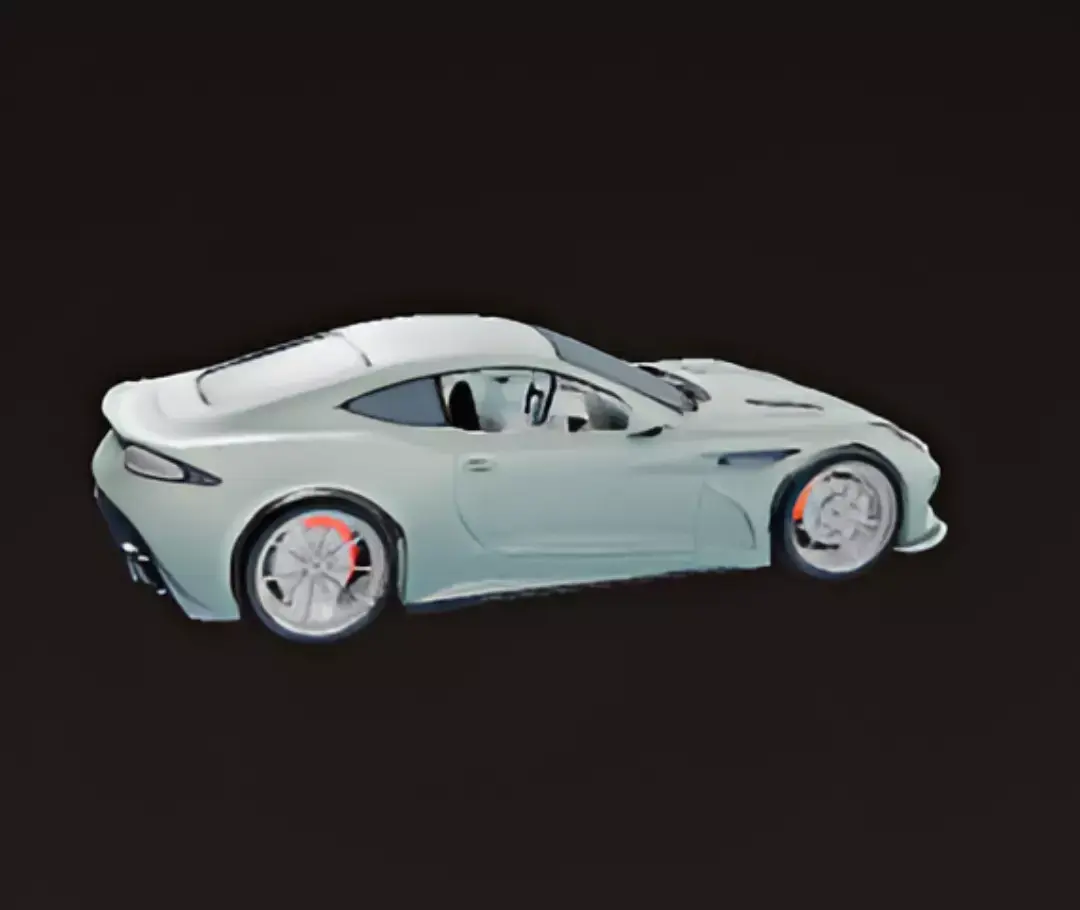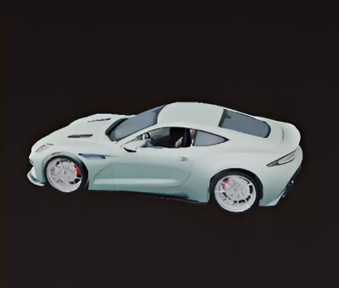 A sleek, mint green Aston Martin DBS Superleggera is displayed from a front-quarter perspective in a clean, studio setting. The car's elegant and muscular body is accentuated by its unique, pale green metallic finish. The prominent grille, long hood with vents, and sculpted lines give it a powerful yet refined appearance. The car sits on multi-spoke bronze or gold-colored wheels, which provide a striking and stylish contrast to the green paint. The overall presentation highlights the car's luxurious design and sporty performance aesthetic.