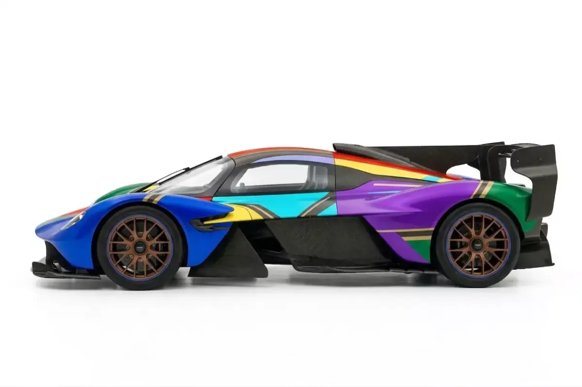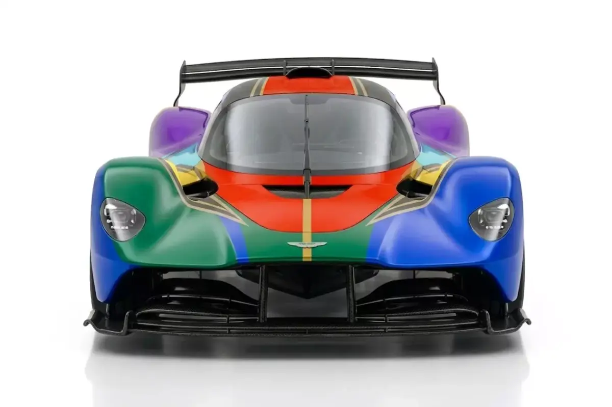 This high-performance 3D asset recreates the Aston Martin Valkyrie AMR Pro, featuring a striking, vibrant multi-color art livery that emphasizes its radical aerodynamic silhouette. The model showcases the extreme no-compromise design of the track-only hypercar, including its elongated wheelbase, massive rear wing, and intricate carbon-fiber venturi tunnels. Every panel is optimized with clean topology for professional rendering, while the custom texture set utilizes advanced mapping to ensure the bold green, blue, red, and purple accents flow seamlessly across the complex curvature of the body. From the bronze-finished magnesium wheels to the exposed carbon weave details, this model is engineered for high-end automotive visualizations, luxury showcases, and ultra-realistic racing environments.