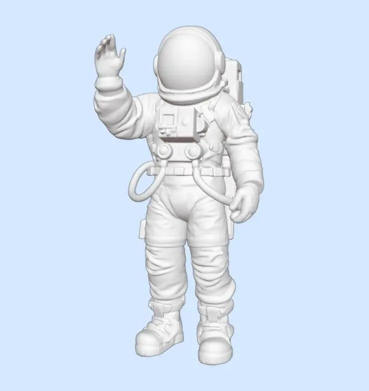This 3D printable model represents a fully suited astronaut in an EVA (Extra-Vehicular Activity) spacewalk pose, captured mid-gesture with one hand raised. The figure includes a detailed modern space suit complete with helmet, life support backpack, front control unit, oxygen hoses, and padded boots. Designed for realism and technical accuracy, the model is suitable for collectors, educational displays, sci-fi dioramas, or space-themed desktop figures. All parts of the suit are clearly defined, and the model maintains a stable upright pose when printed.