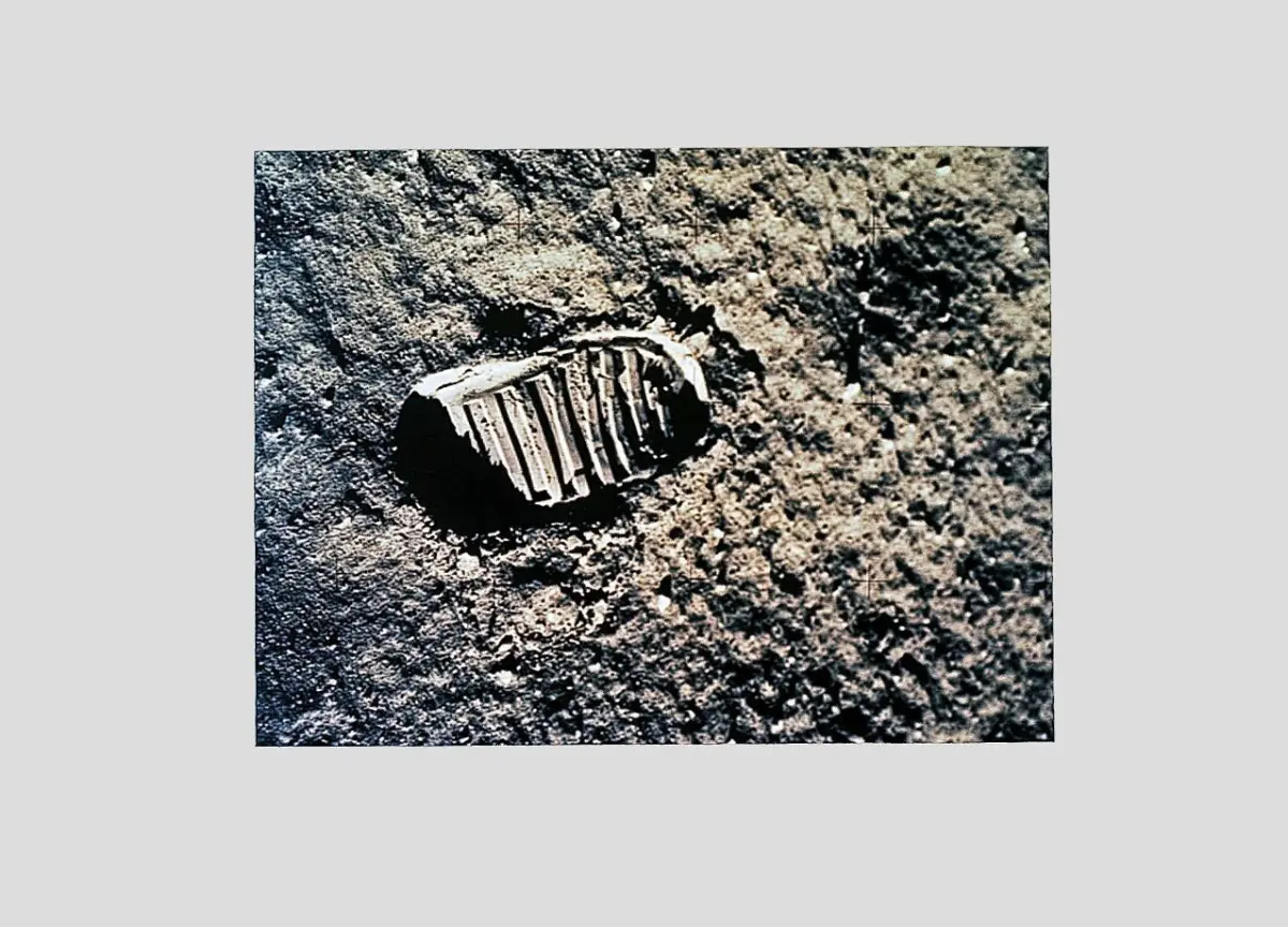 Apollo 11 astronaut Edwin Aldrin photographed this footprint in the lunar soil as part of an experiment to study the nature of lunar dust and the effects of pressure on the surface. The dust was found to compact easily under the weight of the astronauts leaving a shallow but clear impression of the boots, characteristic of a very fine, dry material. The footprint image has also become one of the enduring symbols of the first visit to the Moon. (Apollo 11, 1969)