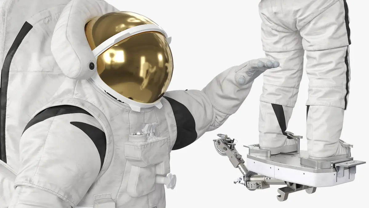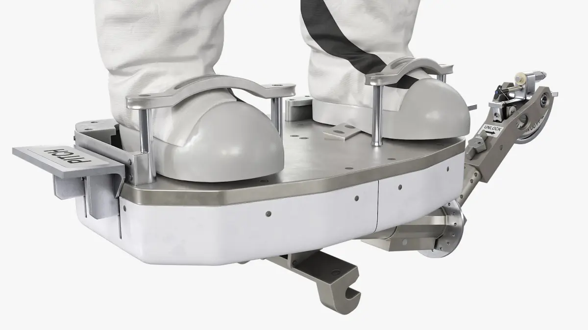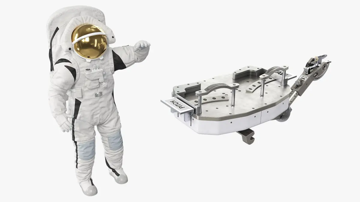 Astronaut on Foot Restraint Platform is a 3d model of an astronaut in a space suit, equipped with a hover device for simulated space missions and equipment training.
