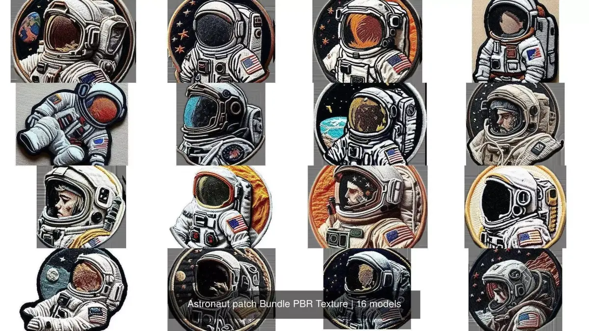 Astronaut embroidered patch. 550x550 pixels png transparent decal. pbr material: diffuse, height, normal, smoothness. Blender file with material ready to use is included. Royalty free license.