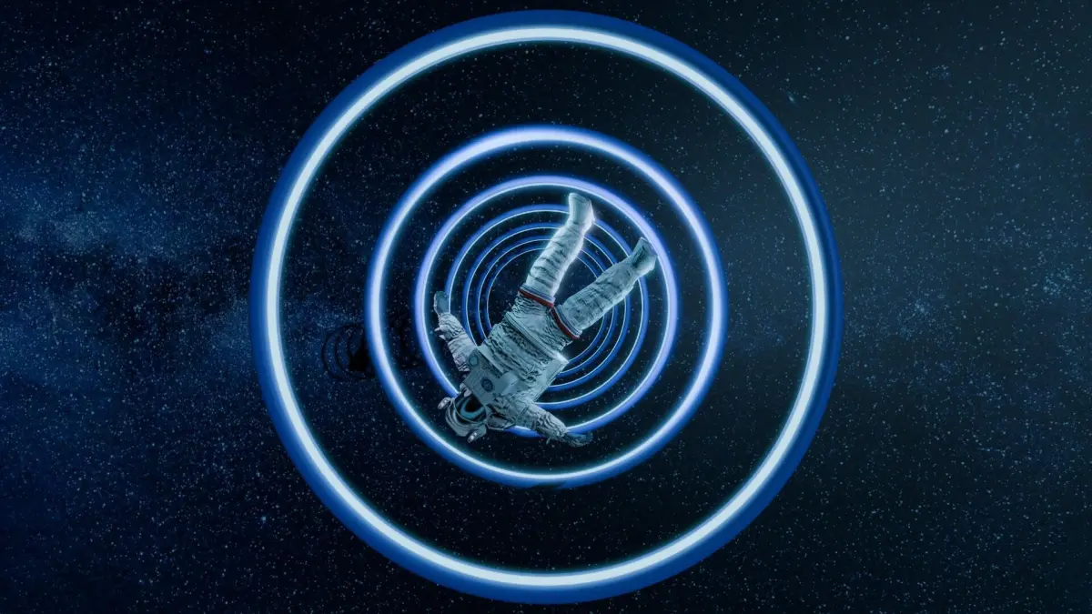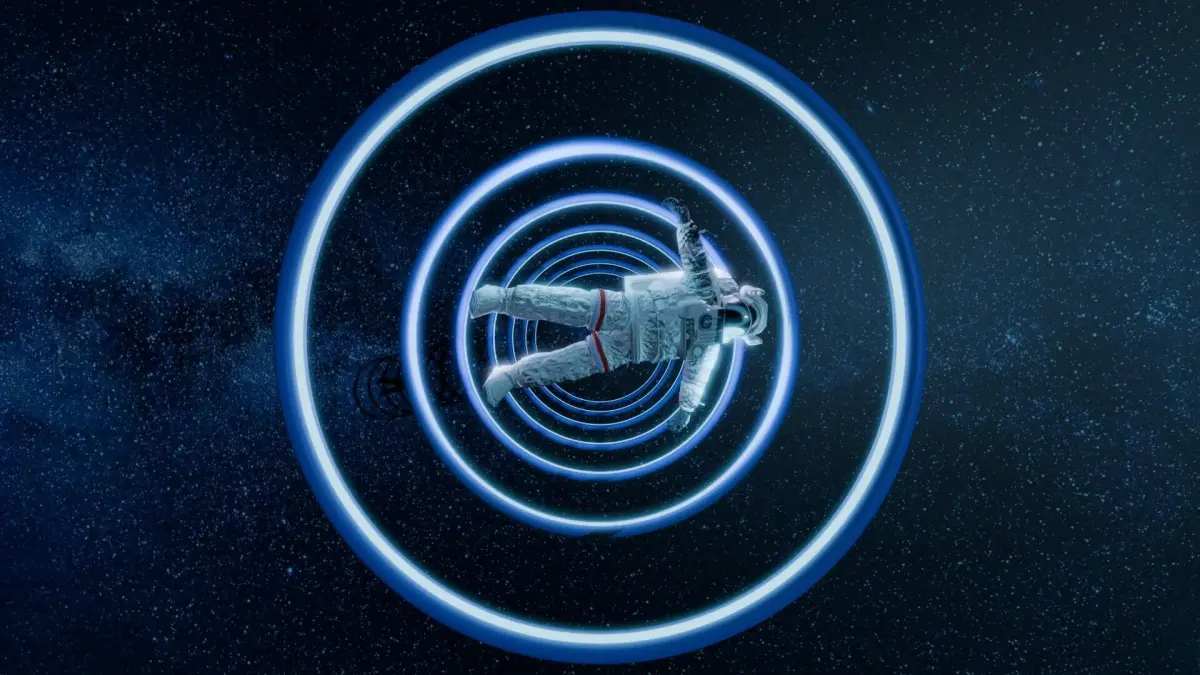 animation of an astronaut spinning in space around a blue glowing orbital circle