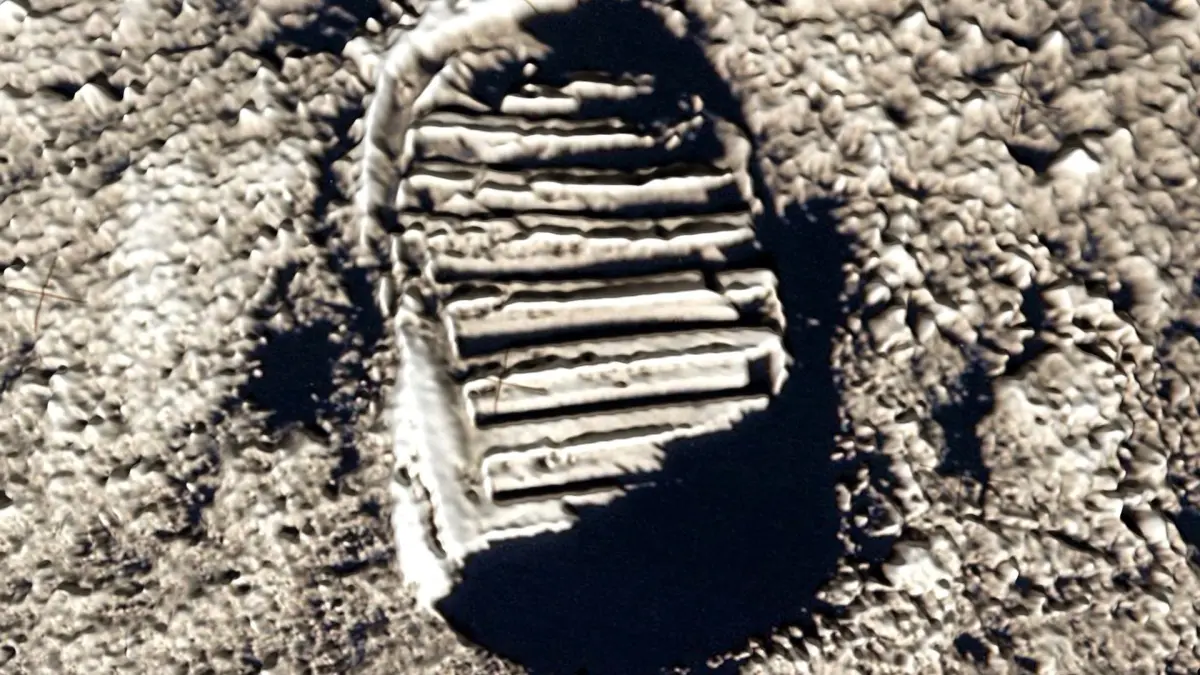 Apollo 11 astronaut Edwin Aldrin photographed this footprint in the lunar soil as part of an experiment to study the nature of lunar dust and the effects of pressure on the surface. The dust was found to compact easily under the weight of the astronauts leaving a shallow but clear impression of the boots, characteristic of a very fine, dry material. The footprint image has also become one of the enduring symbols of the first visit to the Moon. (Apollo 11, 1969)