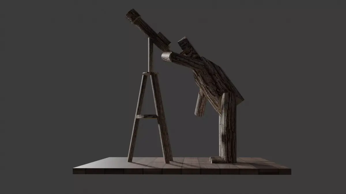 This imaginative stickman sculpture captures a moment of curiosity and wonder. Built entirely from found sticks, each piece is cut and assembled to form a rustic figure holding a handmade telescope — also crafted from sticks. The stickman stands in a pose of intent focus, peering into the distance as though searching the stars or surveying the horizon. Natural bark textures and uneven shapes give the figure an organic, woodland charm, while the wood plank base provides a simple, earthy foundation. Quirky, inventive, and delightfully odd, this piece blends nature, humor, and creativity into a whimsical work of art.