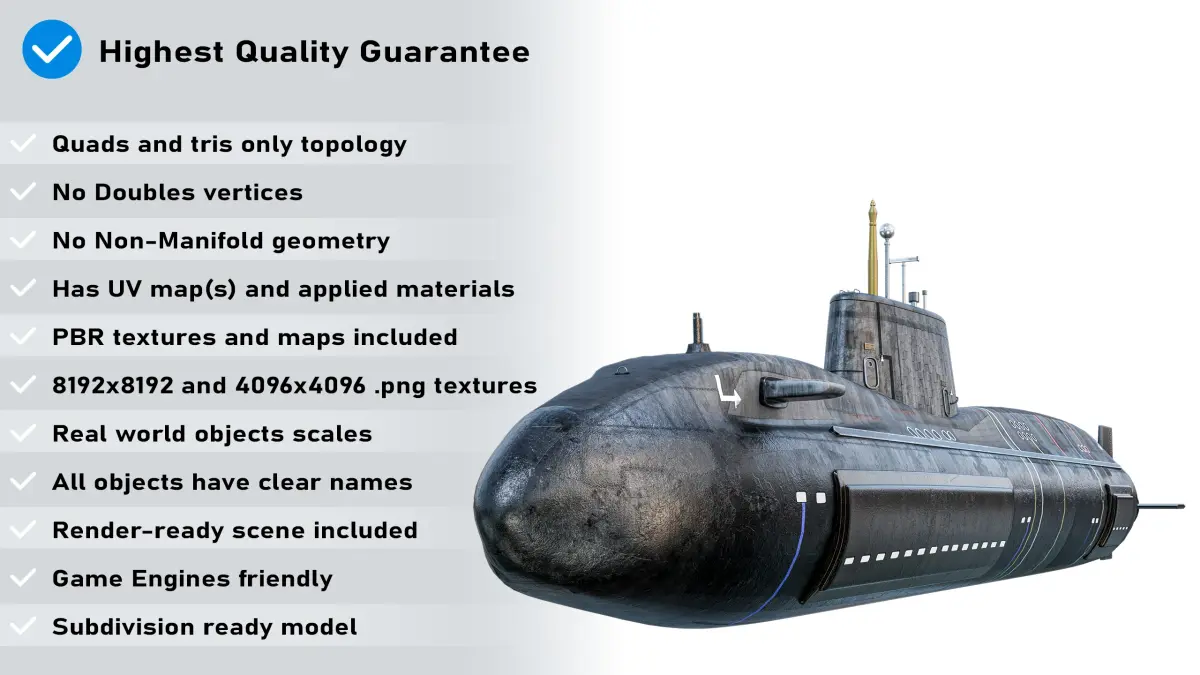High quality, super realistic game and render ready model of the Astute Class Submarine. The model was created with the highest quality standards:
