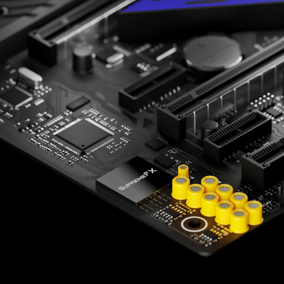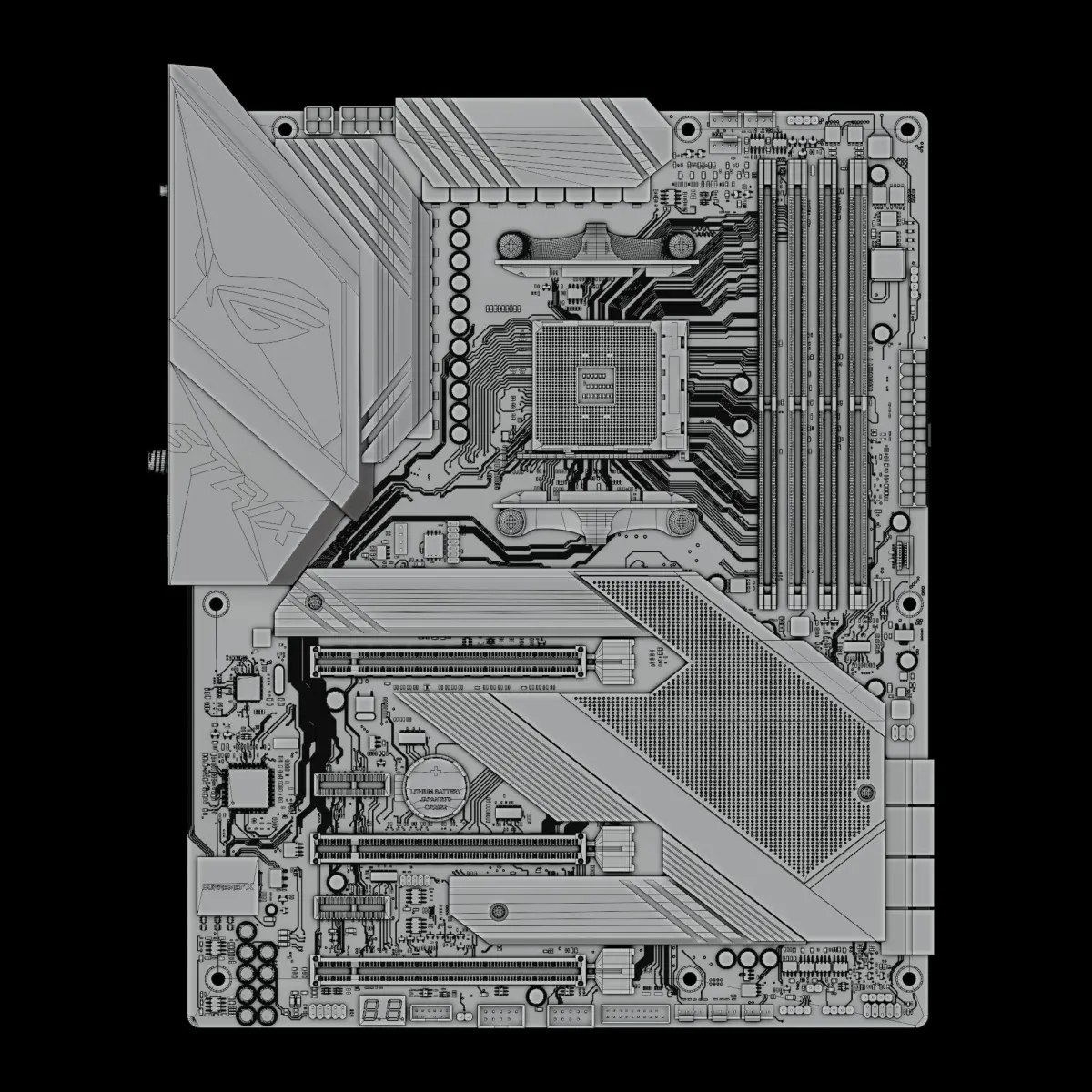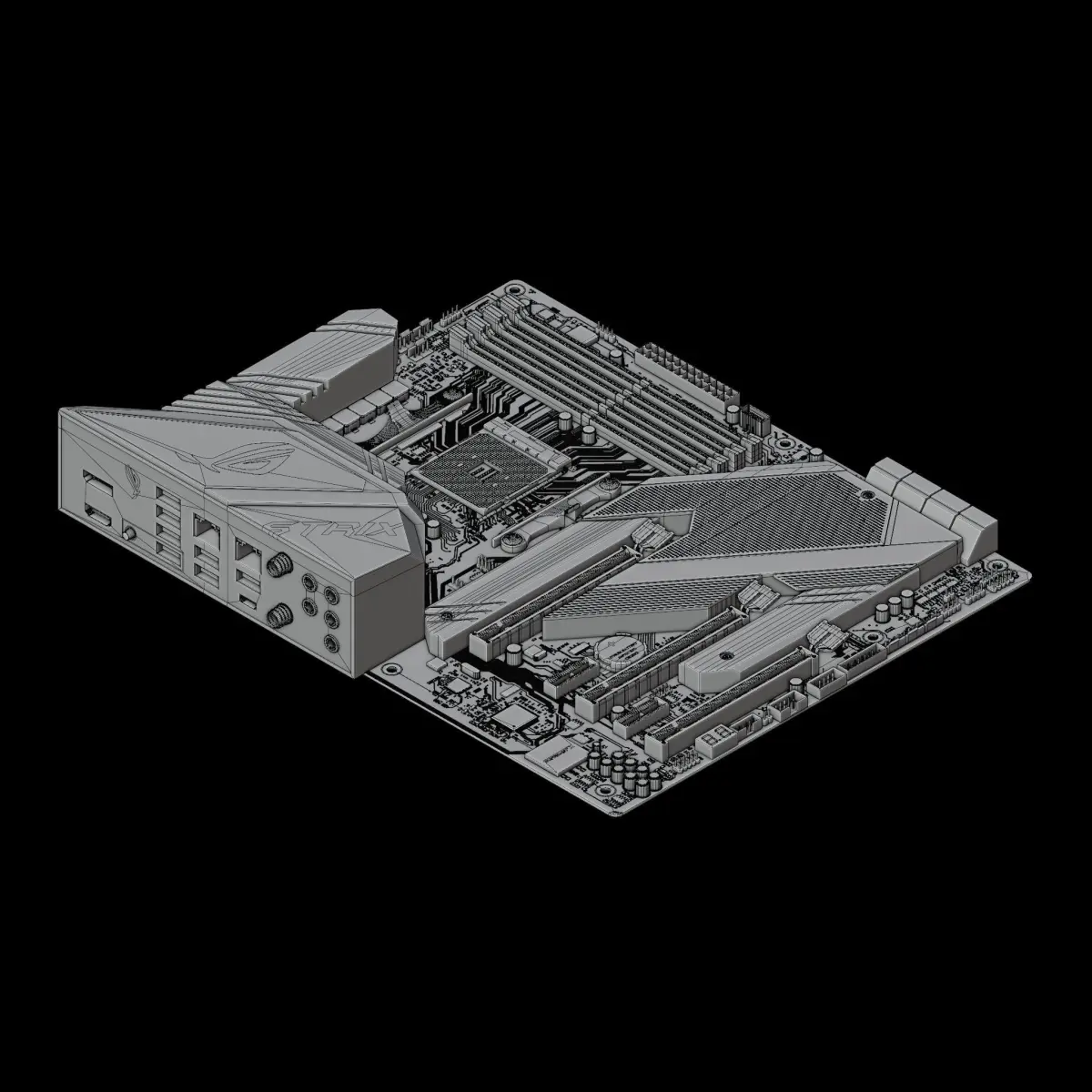 This model is a highly detailed and accurate recreation of the ASUS ROG STRIX X570E-GAMING motherboard.