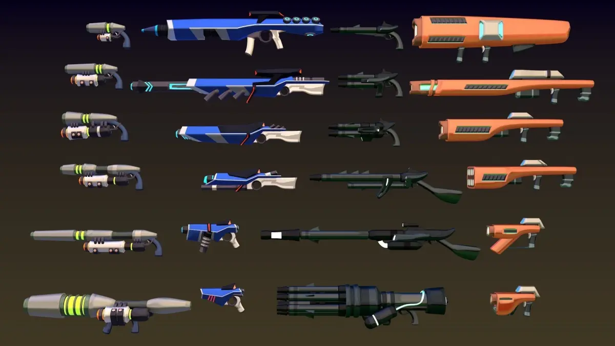 This is a collection of fun sci-fi looking guns for your project. 4 different styles in 6 sizes each.