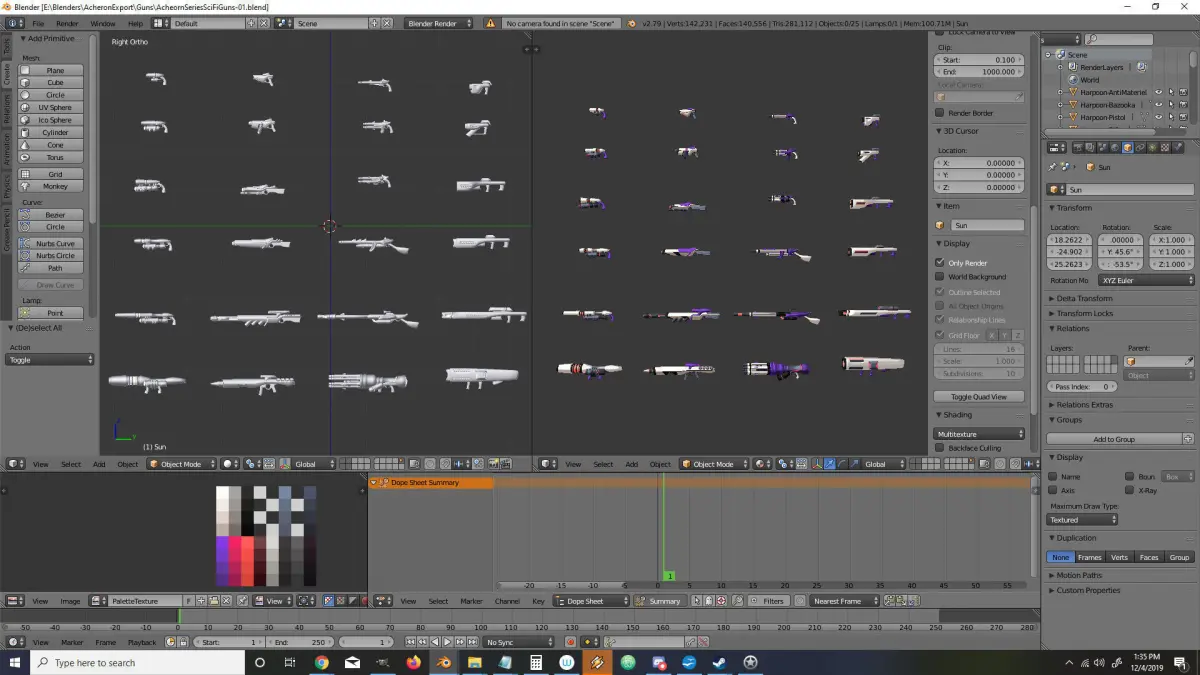 The models are low-poly, they each come as SubSurfed or Not, in FBX, OBJ and original Blender. The models use a simple UV color palette that can be easily swapped out or edited. Over 90 palettes are included.