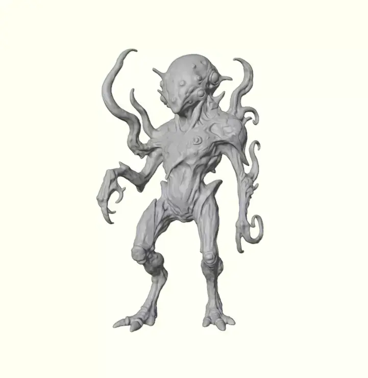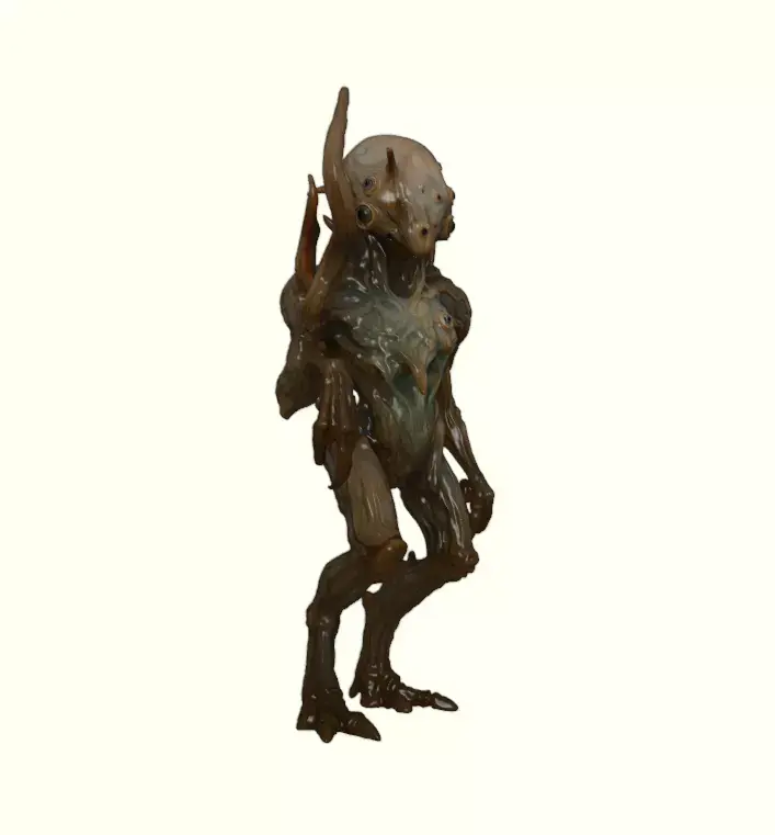 This 3D model portrays a strikingly asymmetrical extraterrestrial life form—an intelligent being whose physiology challenges all notions of earthly biology. Its multi-limbed form features twisting, organic appendages, uneven limbs, and layered textures that seem to pulse with alien vitality. Multiple eyes scattered across its head suggest a species evolved for total spatial awareness, while its stance conveys both intellect and latent power.