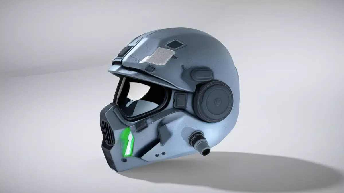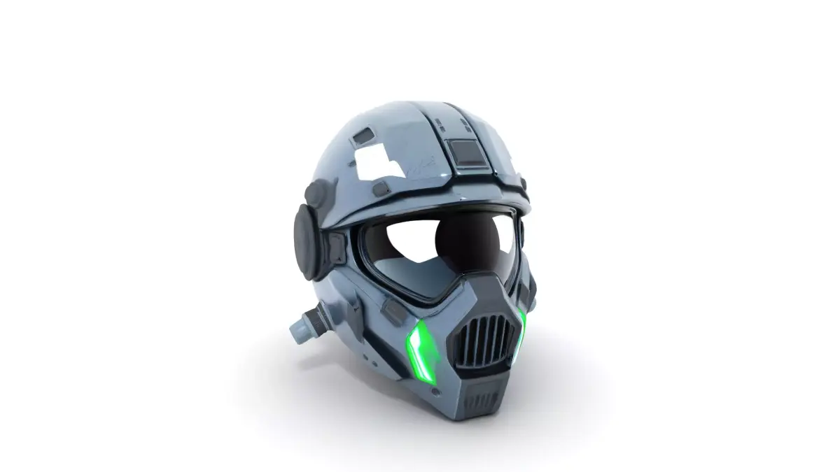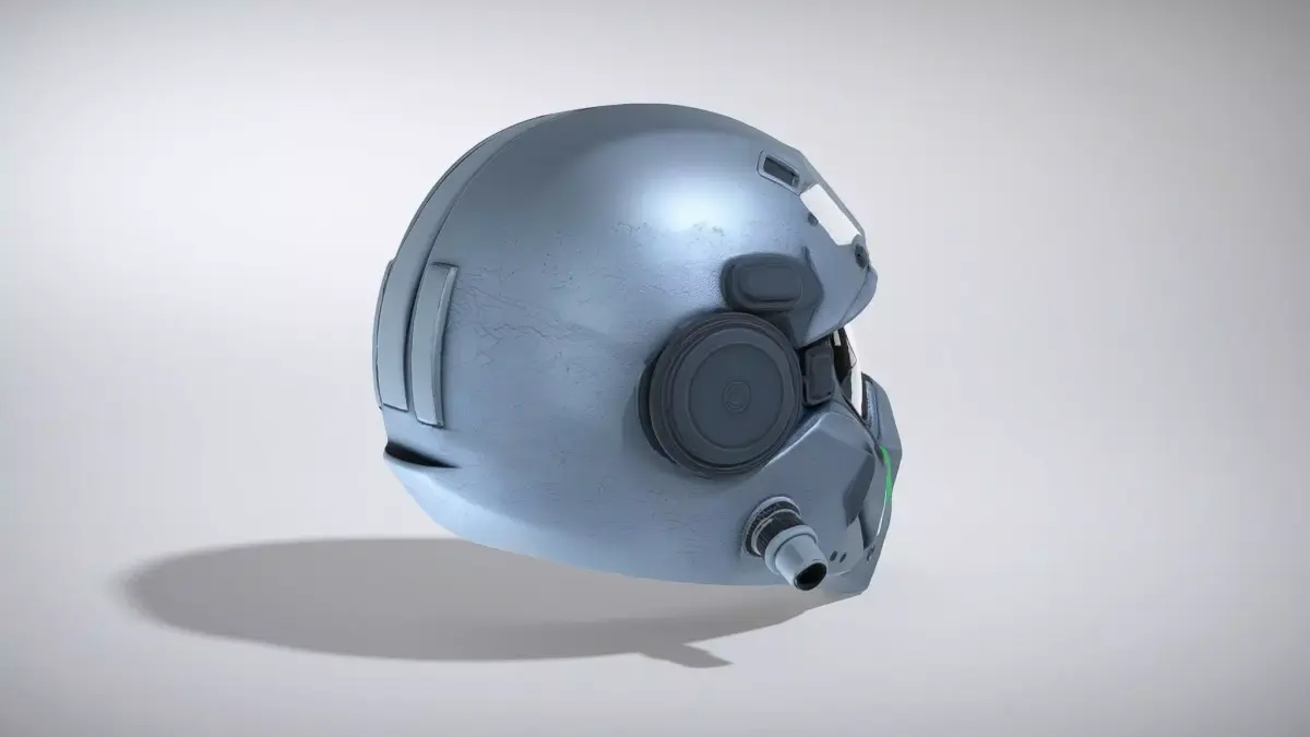 This futuristic cyber helmet showcases an asymmetric design with a large cyclops night vision lens, thick armored brow, and a vented respirator mouth grille. Ideal for sci-fi environments, it features micro cameras and neon green edge lighting, making it perfect for high-quality visual models. Each model has 3 levels of detail with QUAD polygons: