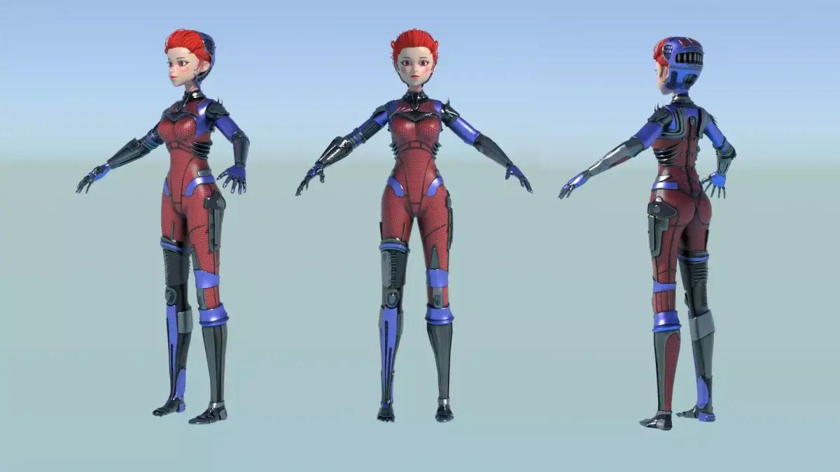 A bold female cyborg in a red-and-blue armored bodysuit with sleek segmented plating and mechanical limbs.She has short, vibrant red hair swept back, revealing cybernetic head components, and intense red eyes with a confident expression.