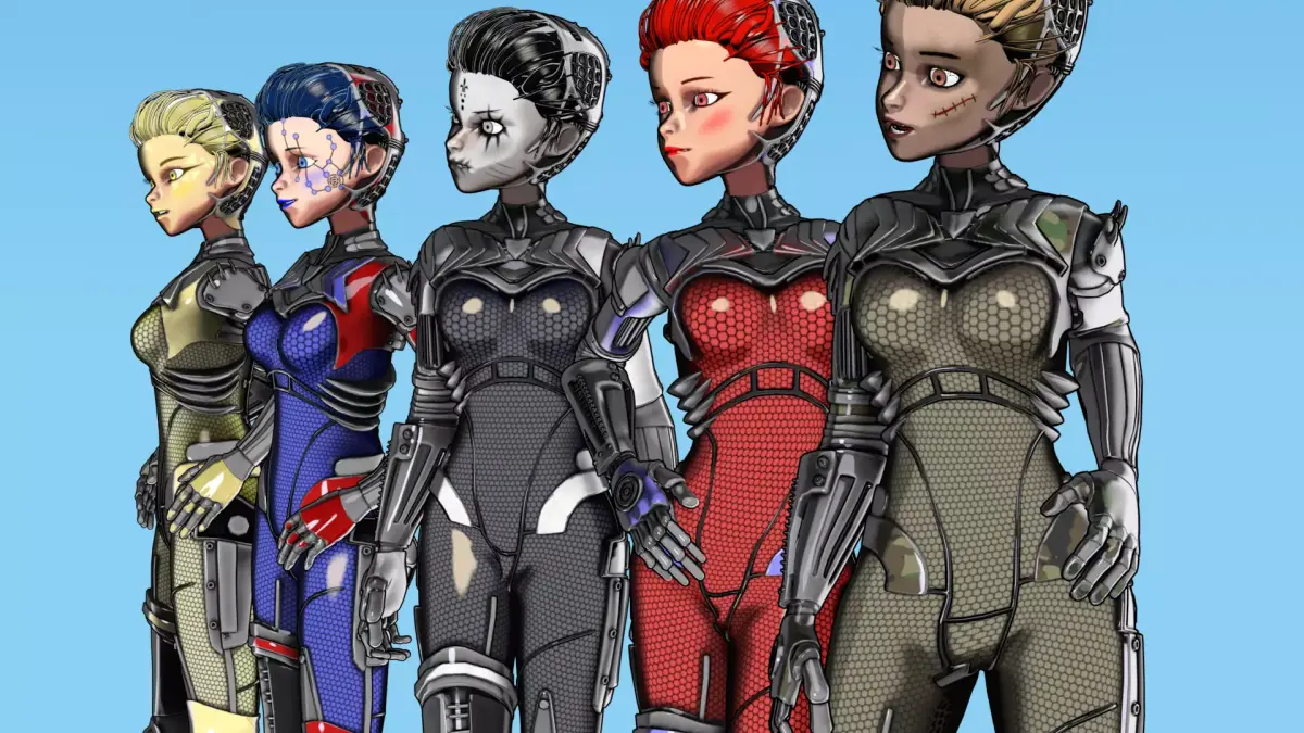 Green Variant – Olive-green and camouflage-pattern suit with silver limbs, natural brown hair, and earthy tones for a tactical feel.