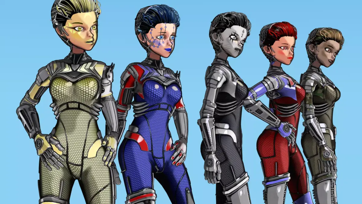 Red Variant – Striking red suit with blue secondary accents, metallic arms, short red hair, and intense gaze. Designed for an aggressive, dynamic look.