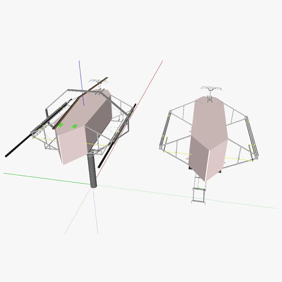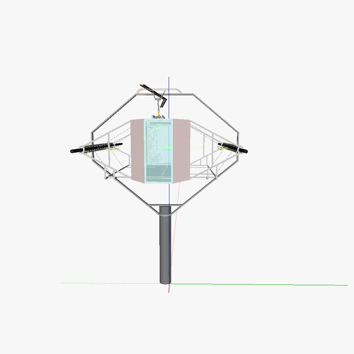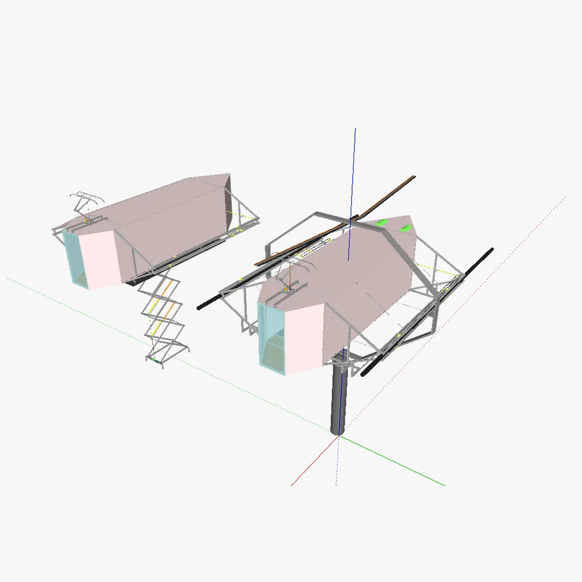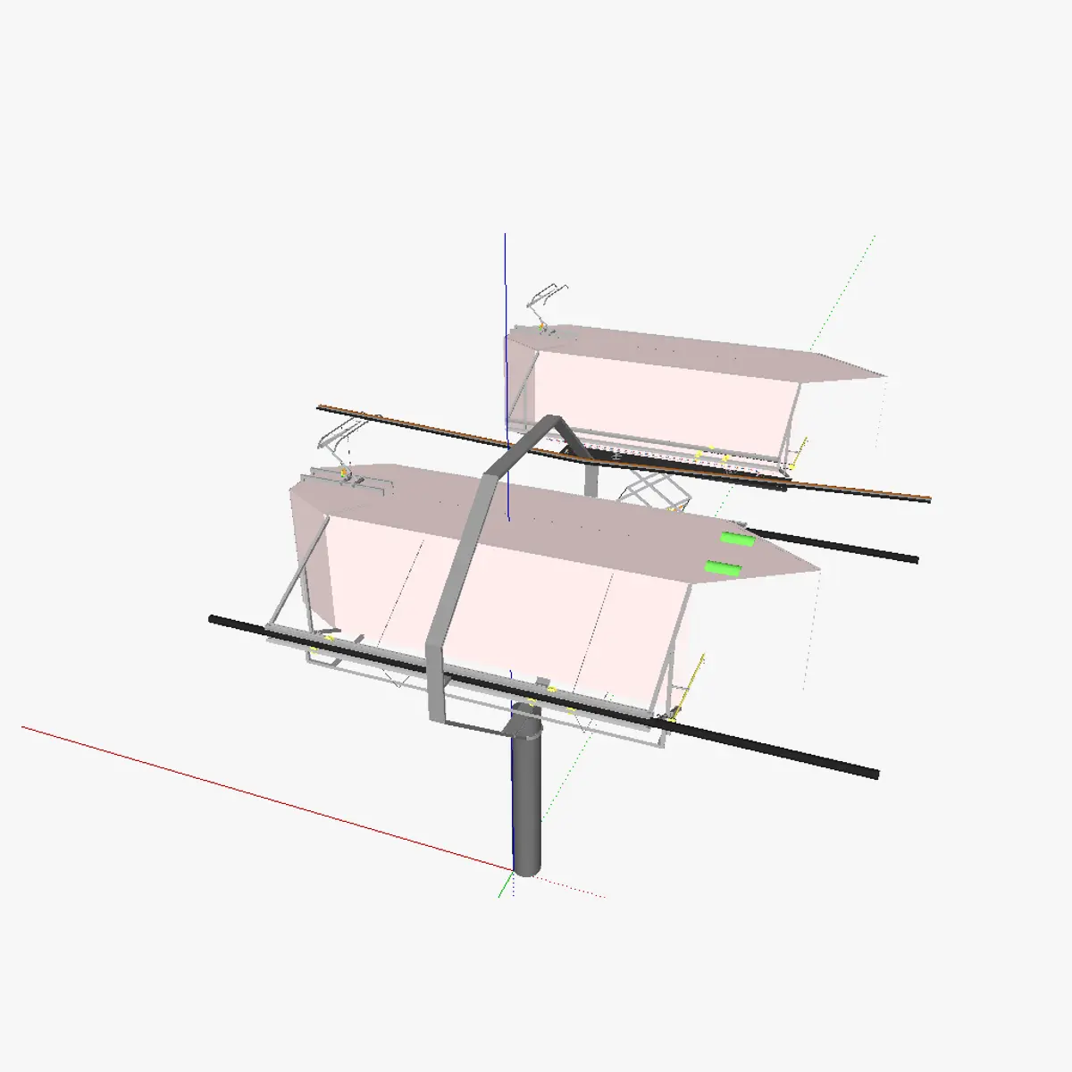 3D model of the AT cable car (cargo-version and passenger-version. The AT cable car (passenger-version) allows the transportation of 10 people, to a number of pickup/dropoff-points (the sequence in which these points are handled can be selected by the people themselves using a control panel in front). The people all have a climbing harness attached to their body. Once they wish to be picked up, they attach a rope to this using a carabiner (the rope is rolled off by a winch motor, which engages when the vehicle arrives at the pickup/dropoff-point). The winch motor (2 motors/axles in the vehicle, can be be mode to engage seperatly or can engage together) also immediatelly opens/closes the loading bay doors (floor). This is done trough additional wires (grey) attached to the axles. Once the person is on board (winched in), he can attach his climbing harness to another rope using another carabiner and disattach his first rope. This way he can securely move to the front of the vehicle to select his desired destination. Once the vehicle is near his arrival point, he can again attach his initial rope and disattach the safety rope for moving around the vehicle. Besides this main version, there is also a cargo-version. This allows to load the vehicle with a large container and also allows to load the vehicle with upto 4 people. Both are placed on the vehicle floor which sits on a scissor elevator. This scissor elevator is placed on a dropoff/pickup location. The floor is attached to the vehicle once the elevator has been fully raised. This is done using 4 solenoids. The propulsion happens with both versions using a electric motor that drives a set of wheels which ride on 2 cables (black in model). Towers are placed at regular distances and hold up these wires, they also hold the overhanging wires that provide power to the vehicle (via the pantograph). See the 'Purchasing_the_models' link at appropedia's AT_CAD_Team for additional information on the model