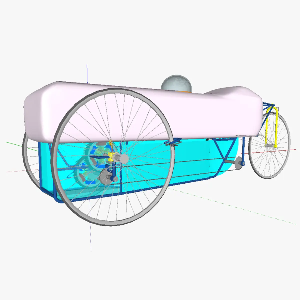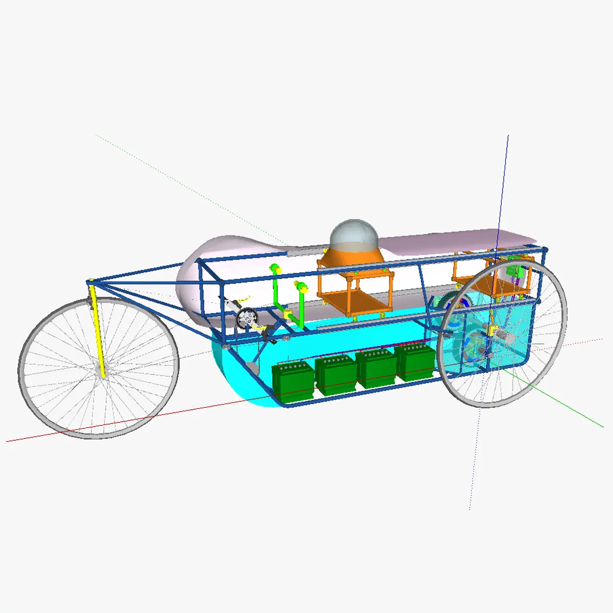 3D model of the AT e-velomobile. The e-velomobile has an electric motor mounted to a back axle (which connects directly unto the bicycle wheels). The bicycle wheels are filled entirely with rubber (not air-filled). It has 2 derailleurs mounted allowing switching between using the electric motor or recharging of the batteries using the pedals. The derailleurs are operated via a green control box (which houses 2 solenoids which control the derailleurs; via a PCB). See the 'Purchasing_the_models' link at appropedia's AT_CAD_Team for additional information on the model