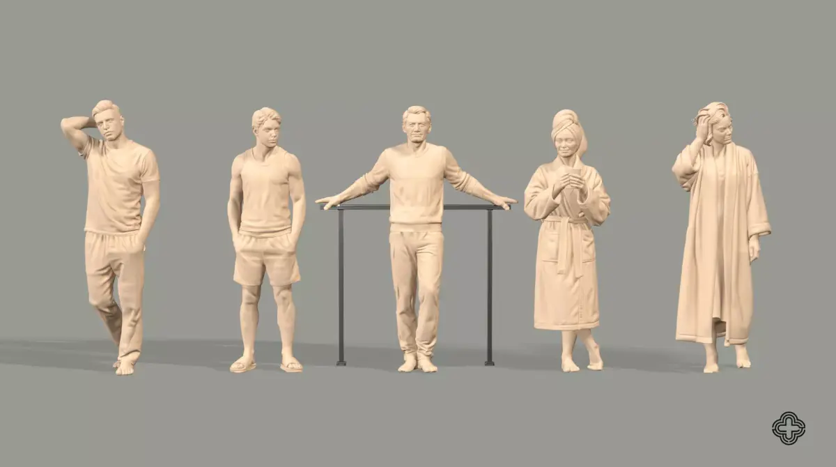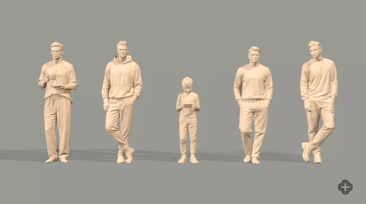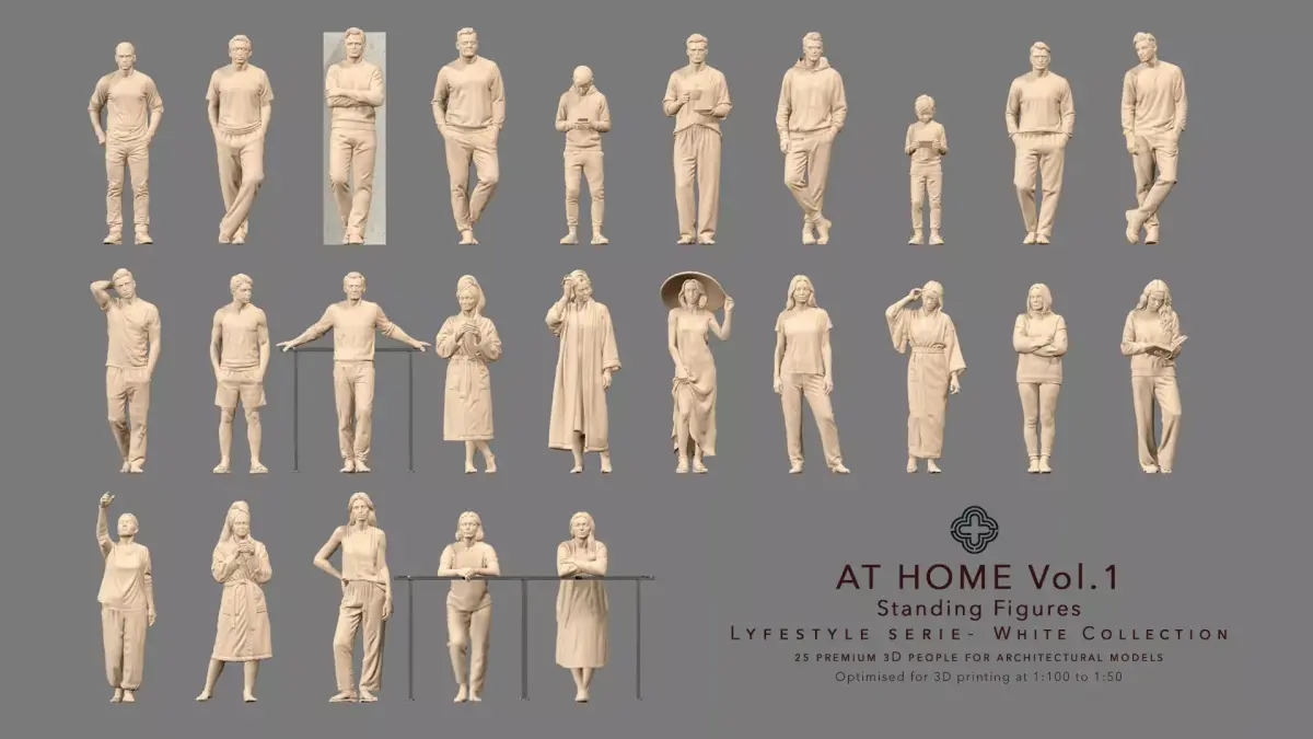 At Home Vol.1 - Standing Figures is a set of 25 architectural figures designed for interior home scenes in architectural models and archviz. These characters stand in quiet, everyday poses: leaning on walls, resting on balcony railings, looking out, waiting or simply inhabiting the space, bringing subtle life and human scale to apartments and houses. Many figures wear comfortable home clothing (loungewear, robes, socks) to underline the intimate, everyday at home atmosphere rather than a formal dress code.