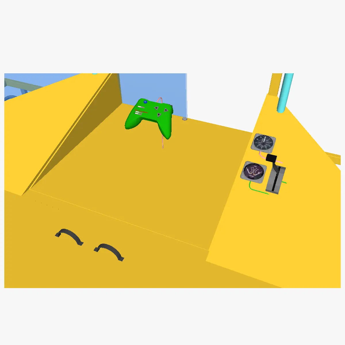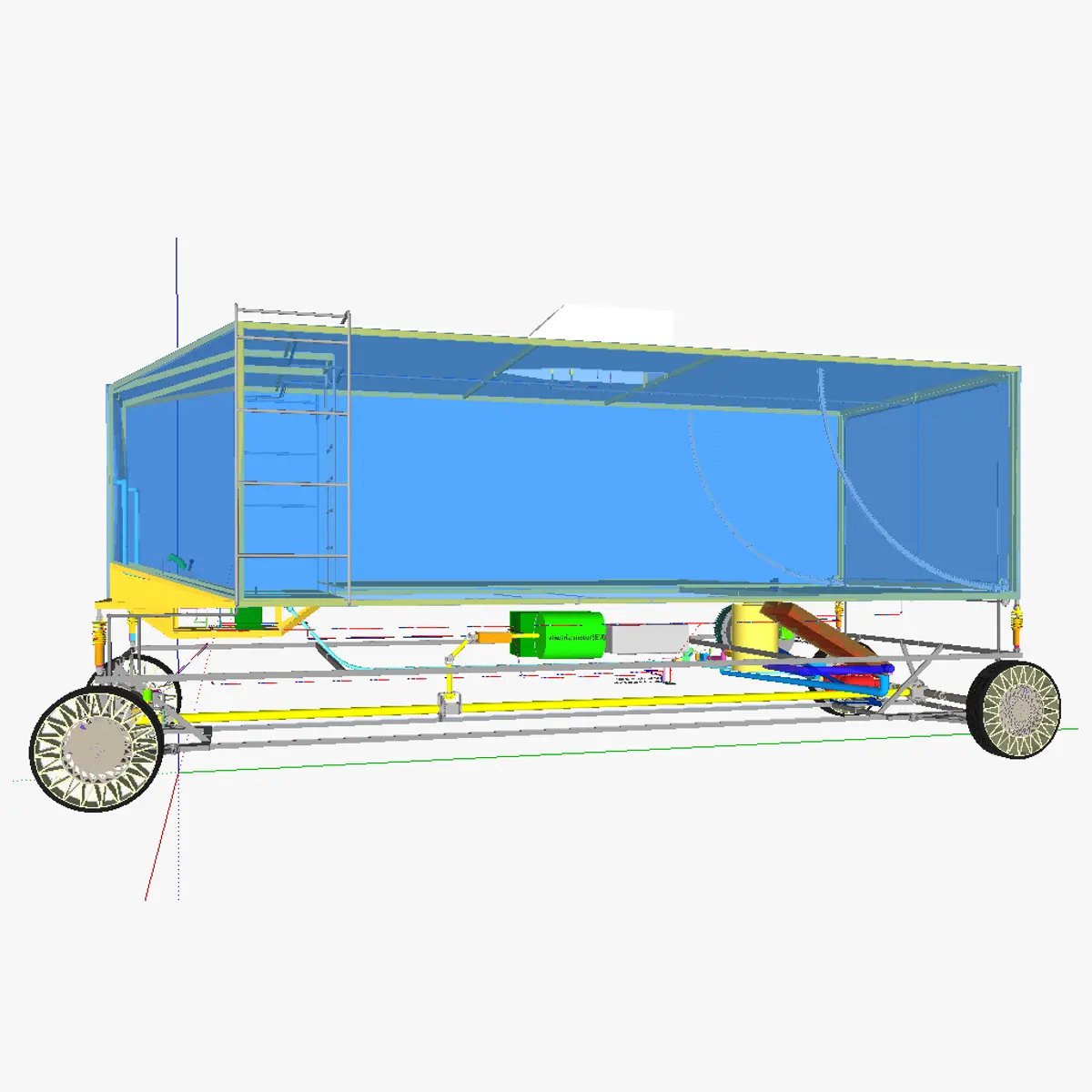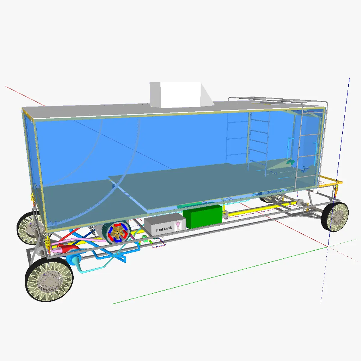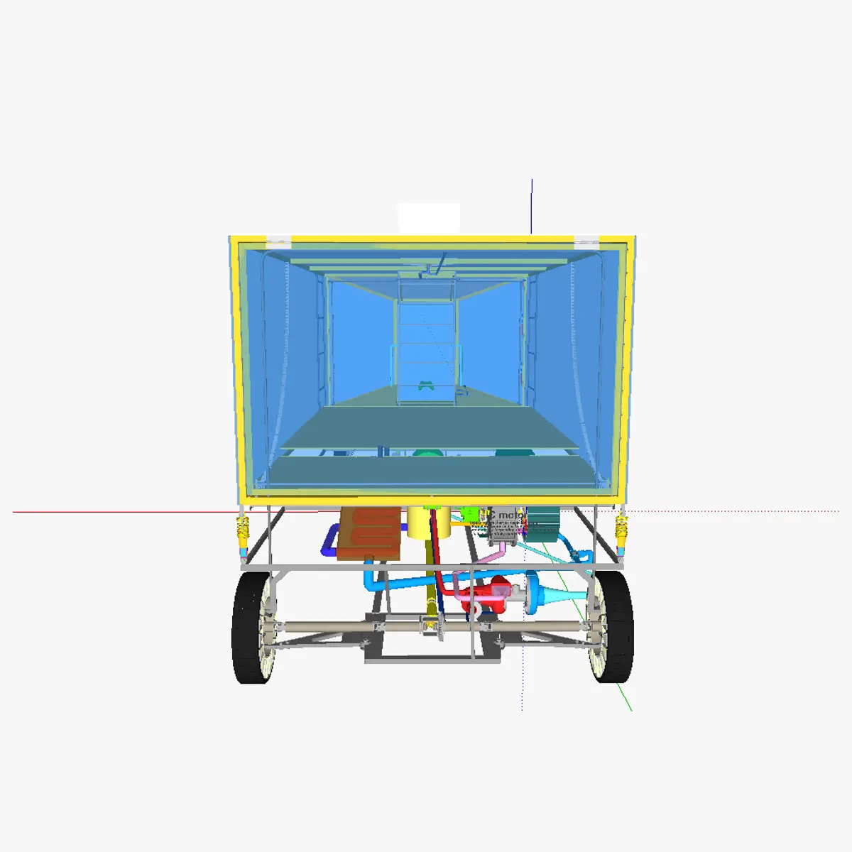 3D model of the AT minivan. This motorized carriage has 4 wheel drive, tweels and an electric motor powered by a capacitor, in turn supplied by electricity from a alternator/dynamo which is rotated using a IC motor. This minivan is thus not a true electric vehicle but a IC-EM hybrid vehicle. The AT minivan is a lightweight vehicle due to the absence of doors, seats, (heavy) conventional frame and coachwork. It is also very aerodynamic (given its size) due to the sloped front side, and the sloping of the shell at the front, redirecting air towards the ground using 2 pipes. It is controlled via a control pad, which controls a PCB which controls the brakes, main motor, back door motor.