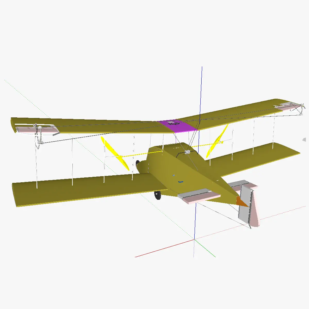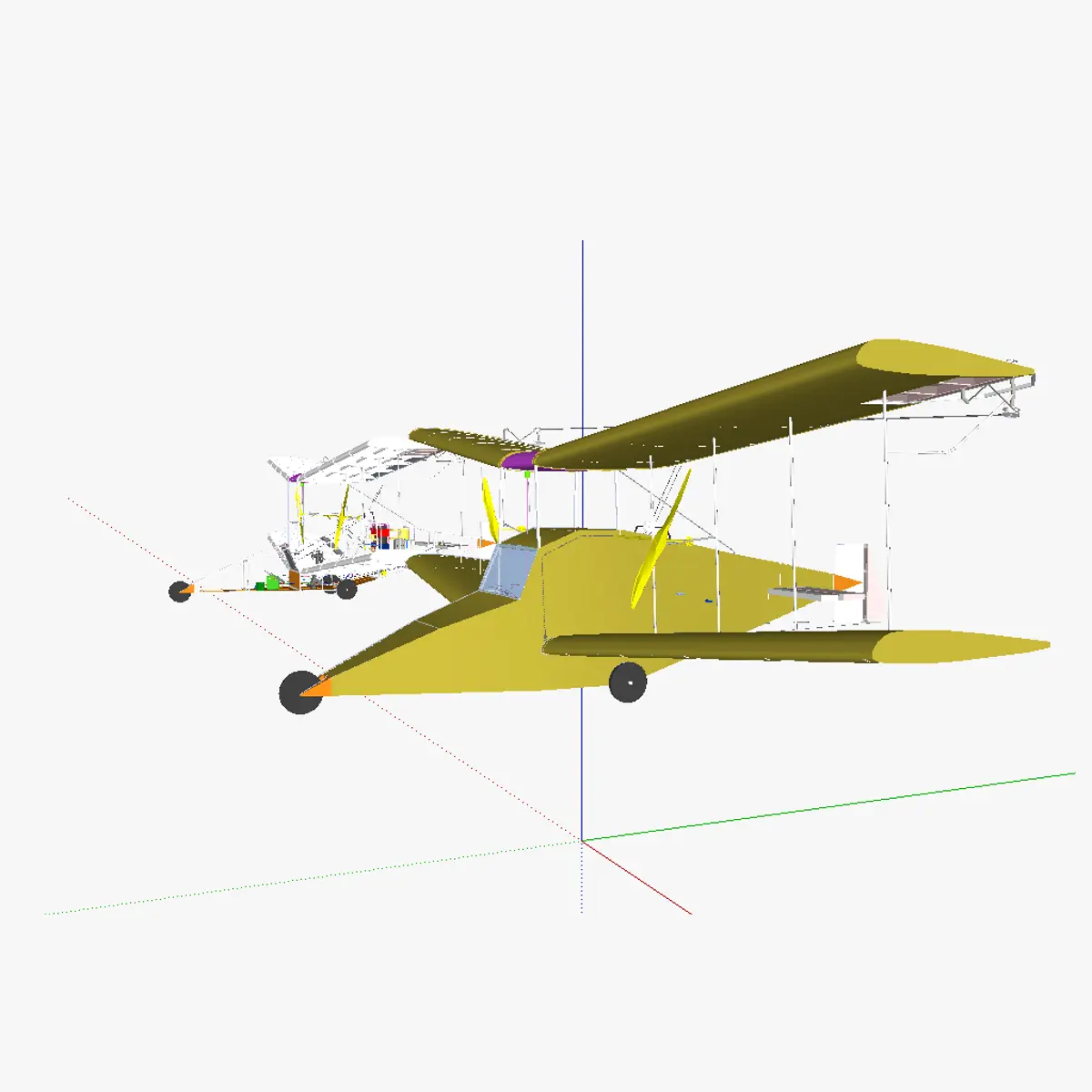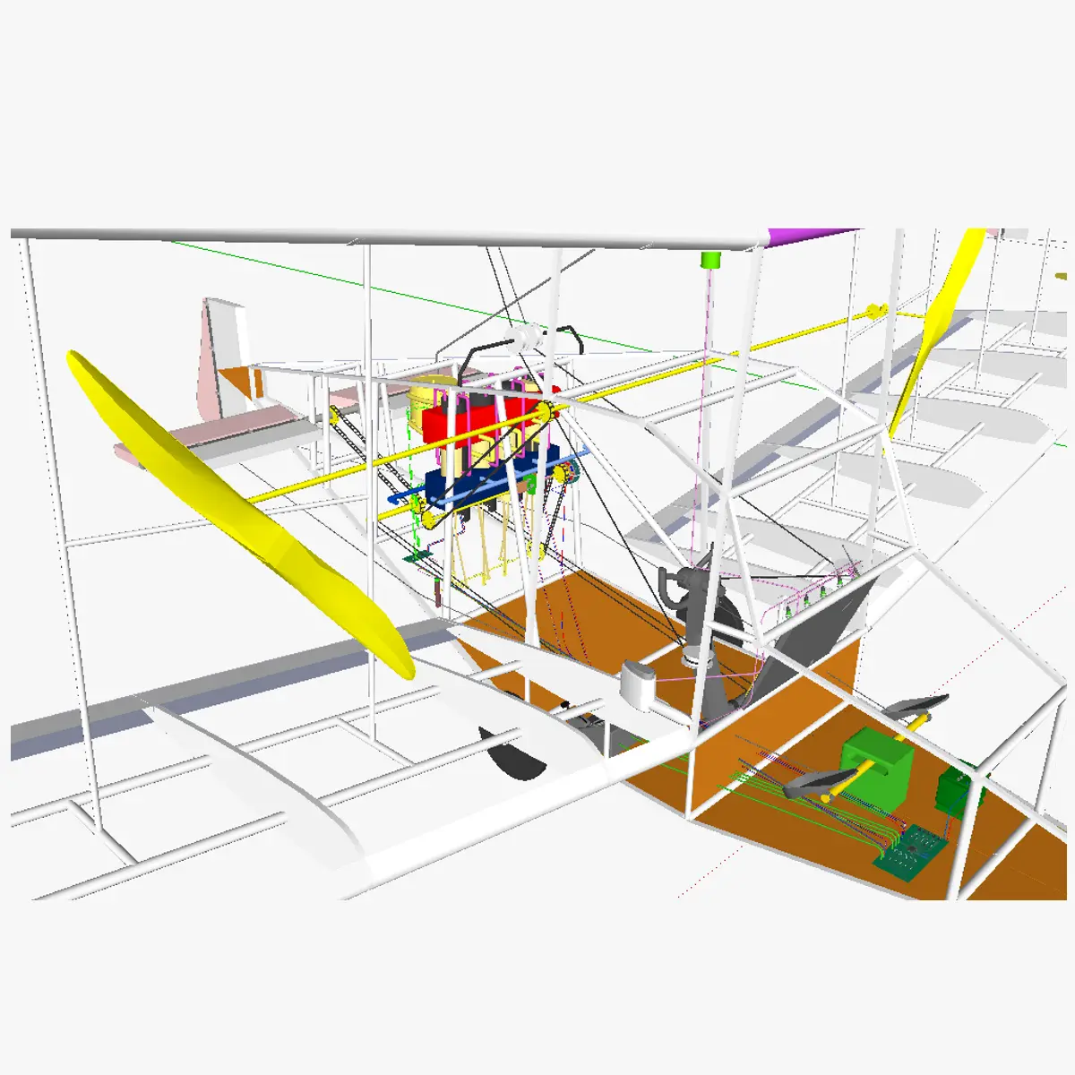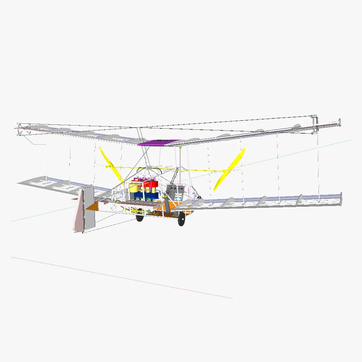 3D model of the AT single person aircraft. As the name implies, the aircraft is intented for the transportation of a single person. The wing profile used is the NACA 43012. Ailerons, rudder and eleavtor are controlled using wires. No flaps are present. The control is done manually using a control yoke and a lever to regulate the speed. Sensors are present to feed additional information to the pilot, however the airplane is not able to fly itself (no autopilot function). In the current model, no levers are present to regulate air/fuel mixture (depending on altitude). Wheel brakes are not foreseen, so taxying is impossible, the airplane needs to be pushed manually. The motor used is a Beta-type Stirling motor. It is heated by a burner running on a second-generation alcohol (for starting) and later-on on N20 (once the motor is hot enough). The motor is cooled by means of air. Heating and cooling is done independantly for (almost) each individual cylinder (3 valves for 4 cylinders). The valves (green objects in the model) are opened/closed by a PCB. The PCB opens and closes the valves by attaining information of a sensor that records the position of the bottom piston (power piston) of the first cylinder. Using this information, the system also immediatelly knows the position of the pistons of the other cylinders and knows which valves to close/open. The pilot has a lever to change from ethanol (or another alcohol, ie methanol or biobutanol) to N20, he can do so once he sees the motor temperature is high enough. In this model, no sparkplugs are foreseen, so the motor needs to be started by manually placing a flame near the fuel mouths. A next version could have sparkplugs fitted, and the motor on/off slider (present in this model) is then usable to engage/disengage the sparkplugs. A very light flywheel is present, used to make the engine run even a bit smoother. A basket clutch is also present, to allow to stop transferring power to the propellers while the engine is still on, this is useful to prevent the motor of turning the propellers untill it has reached full power (full power is necessairy for the airplane to be capable of taking off from a runway). The clutch is operated by a slider by the pilot, this is possible due to the use of a solenoid. A gearbox is also present in the model (brown box); this part is optional and if mounted, should be electrically operated. This allows the systems itself to select the appropriate gear, rather than having the pilot to need to select it. The power of the motor is then relayed to both propellers (both propellers always rotate at a same speed).