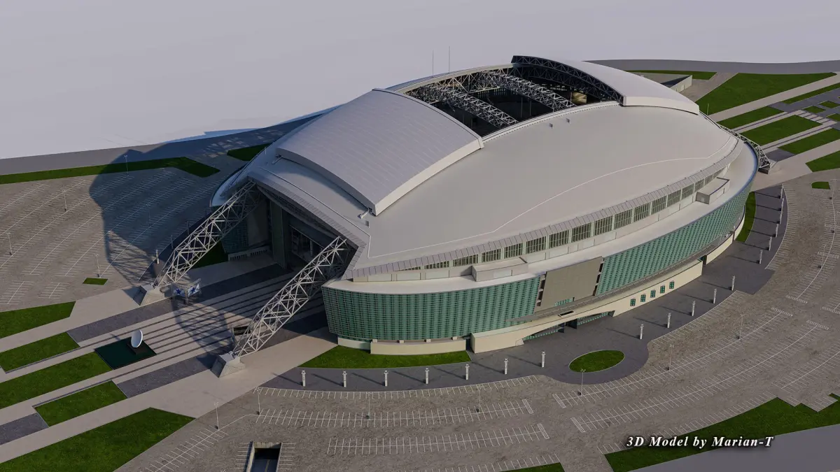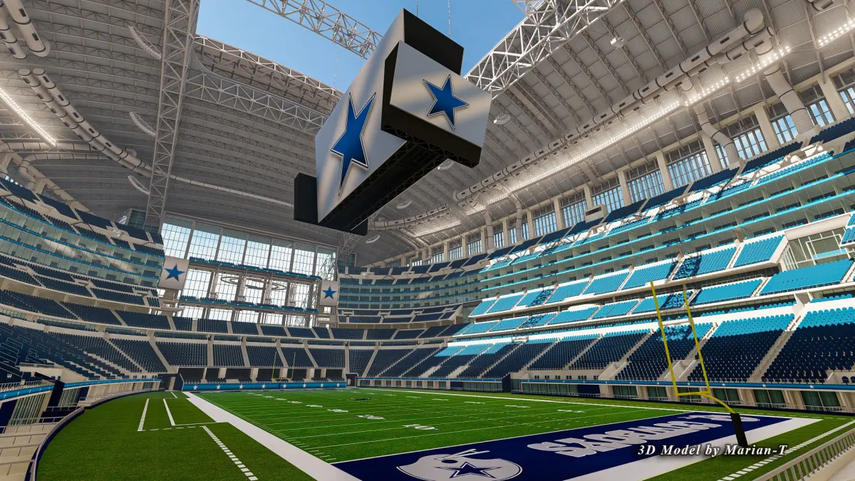 The 3D model is based on real world AT&T Stadium 's photos references both inside and outside, created with approximate dimensions. .