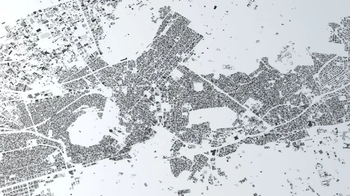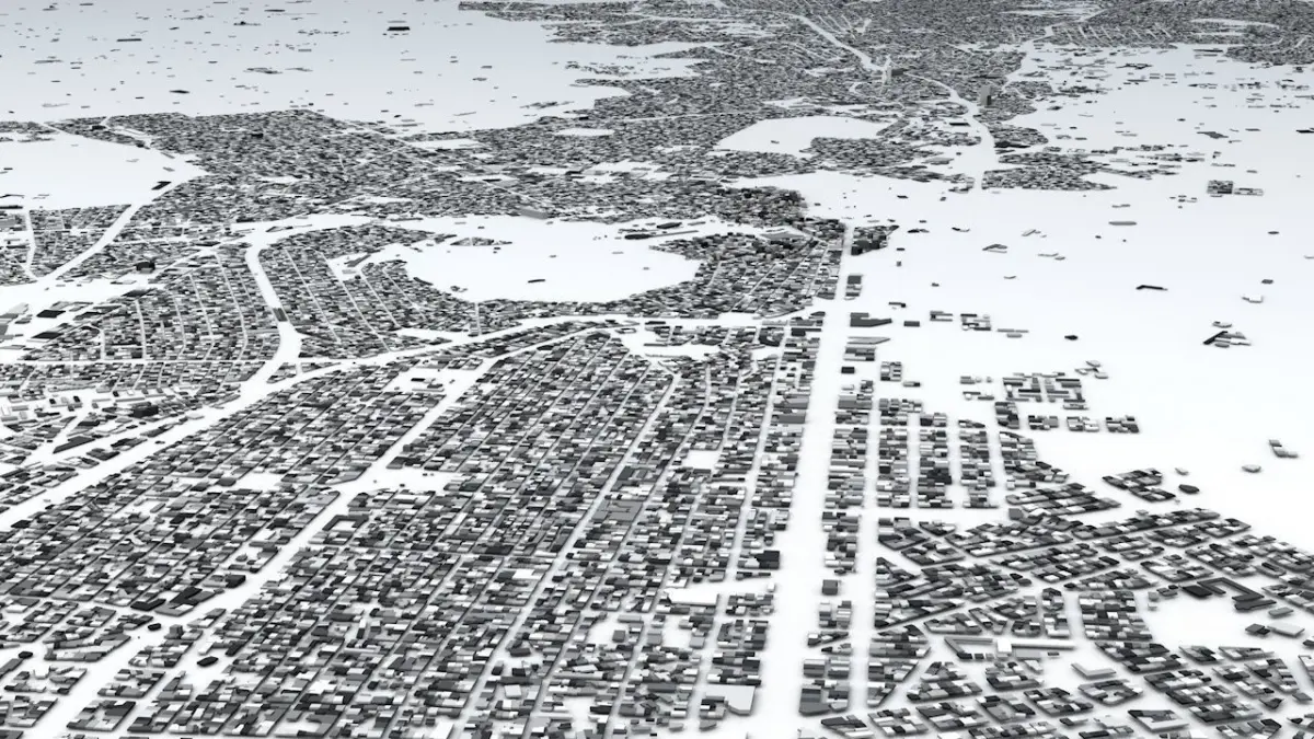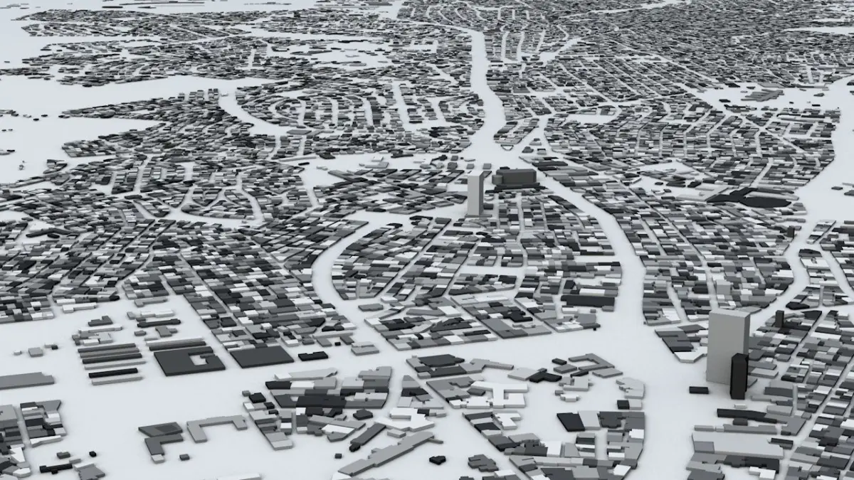 - the model is positioned on a flat surface (all buildings are on the “floor” - no elevation data included)