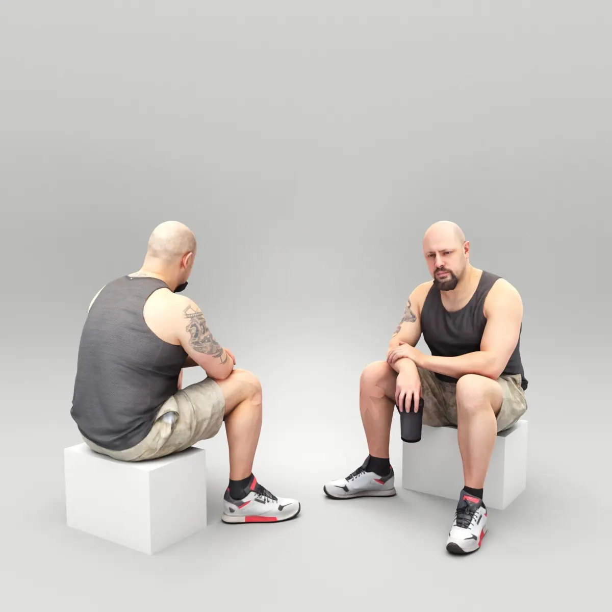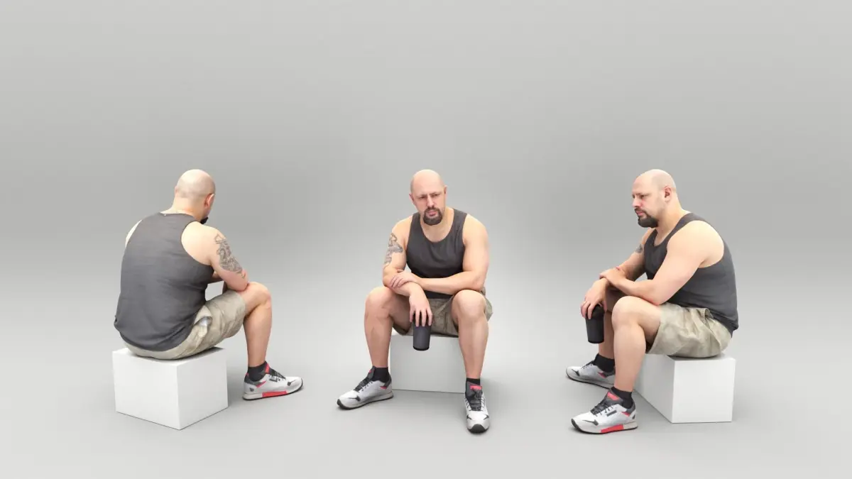 This is a true human size and detailed model of a sporty handsome young man of Caucasian appearance dressed in a sportswear. The model is captured in a casual pose to be perfectly matching to various architectural and product visualizations as a background, mid-sized or close-up character on a sport ground, gym, park, VR/AR content, etc.