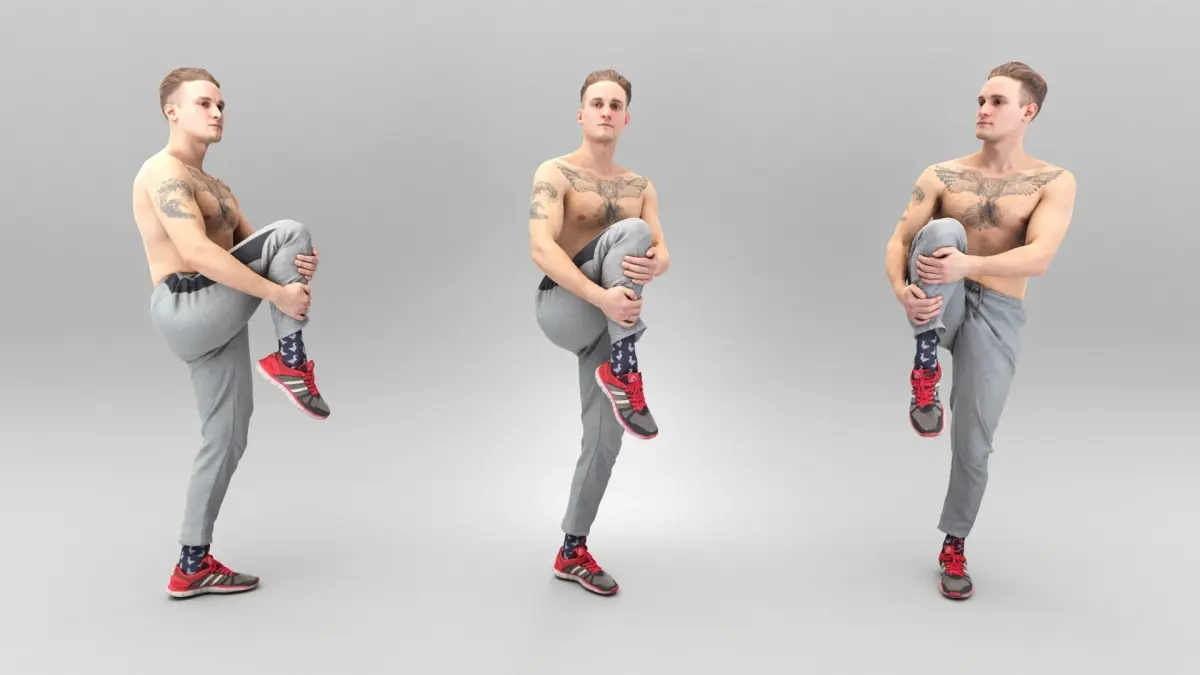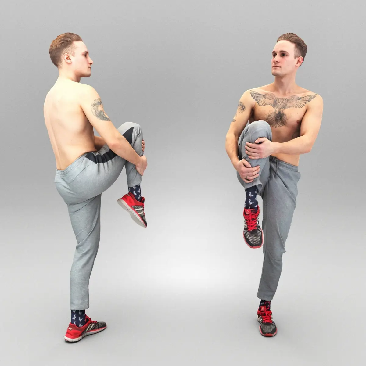 This is a true human size and detailed model of a sporty handsome young man of Caucasian appearance dressed in a sportswear. The model is captured in a casual pose to be perfectly matching to various architectural and product visualizations as a background, mid-sized or close-up character on a sport ground, gym, park, VR/AR content, etc.