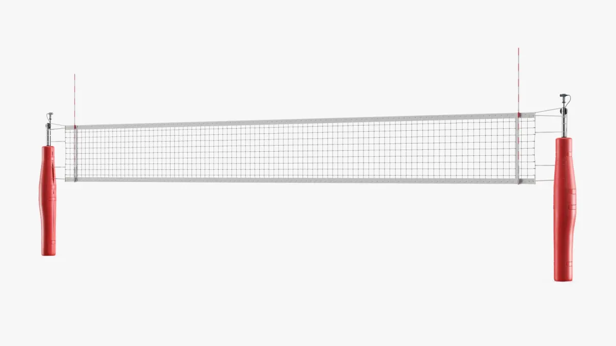 This 3D model features a detailed net with realistic mesh spacing, regulation-height tension cables, and vibrant red safety padding around the poles. The padding includes visible stitching and contour lines for added realism. Each component is carefully modeled to showcase precision, durability, and the authentic look of a competition-grade system used in sports arenas and gymnasiums.