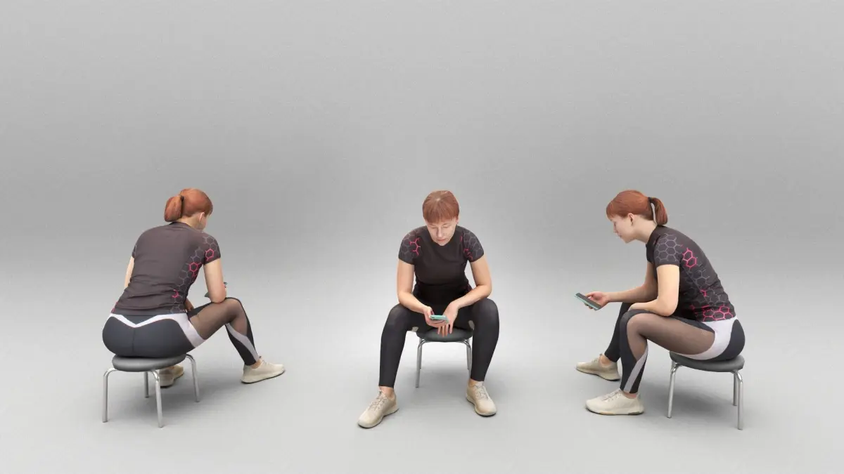 This is a true human size and detailed model of a sporty beautiful woman of Caucasian appearance dressed in sportswear. The model is captured in casual pose to be perfectly matching various architectural and product visualizations, as a background or mid-sized character on a sports ground, gym, locker room, beach, park, VR/AR content, etc.