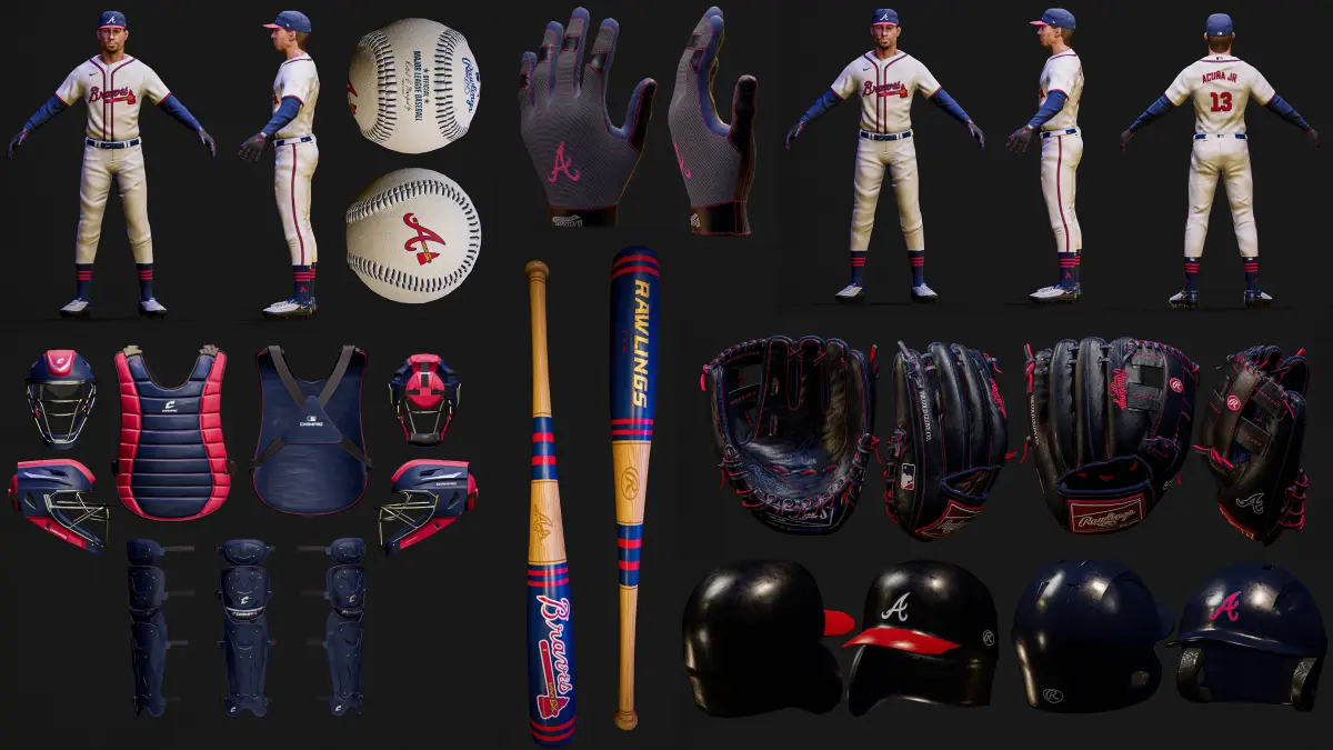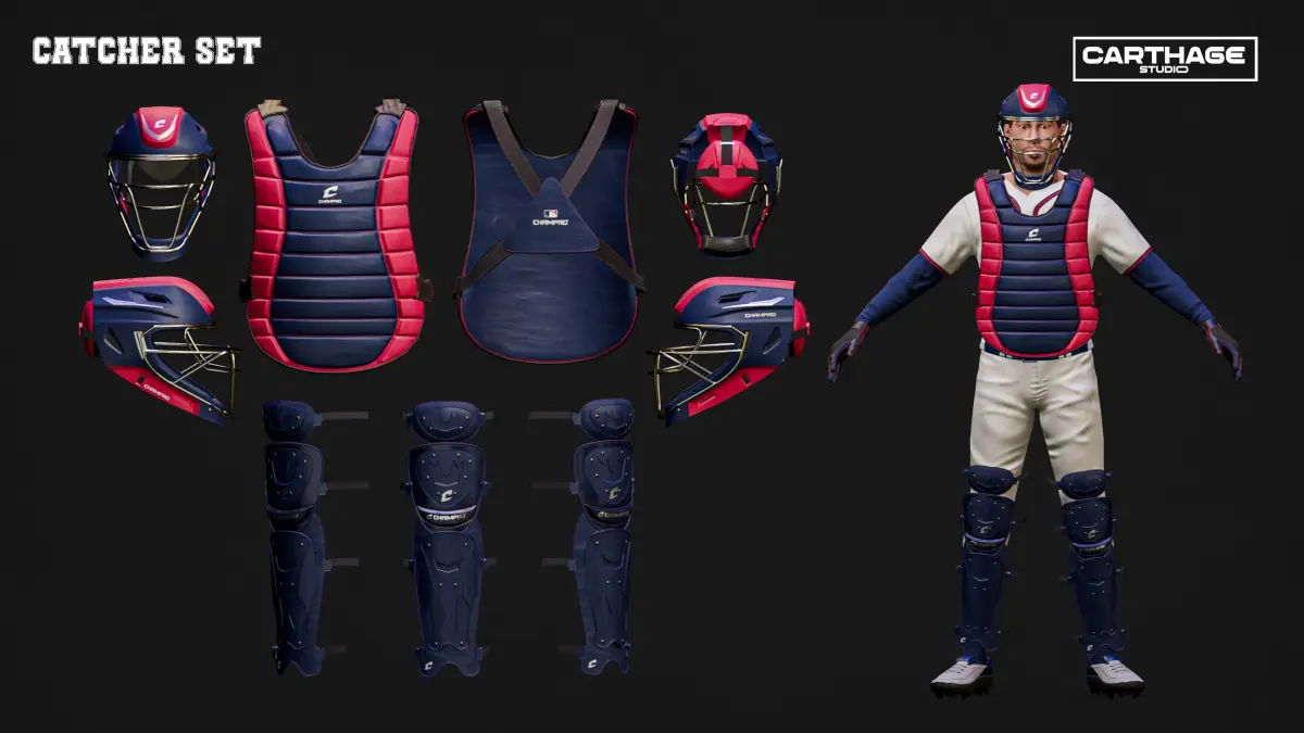 Catcher’s Set: Includes chest protector, leg guards, and helmet with detailed texturing.