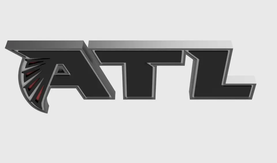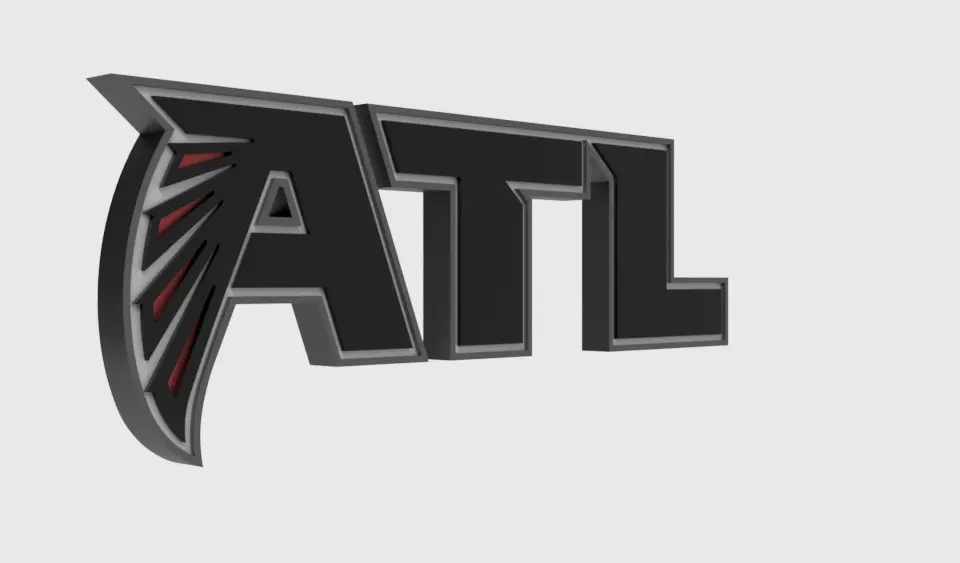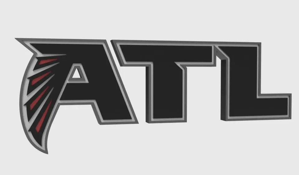 The Atlanta Falcons logo shows a black falcon bird from the side with red features and outlined in silver. The falcon is positioned to be in the shape of an F