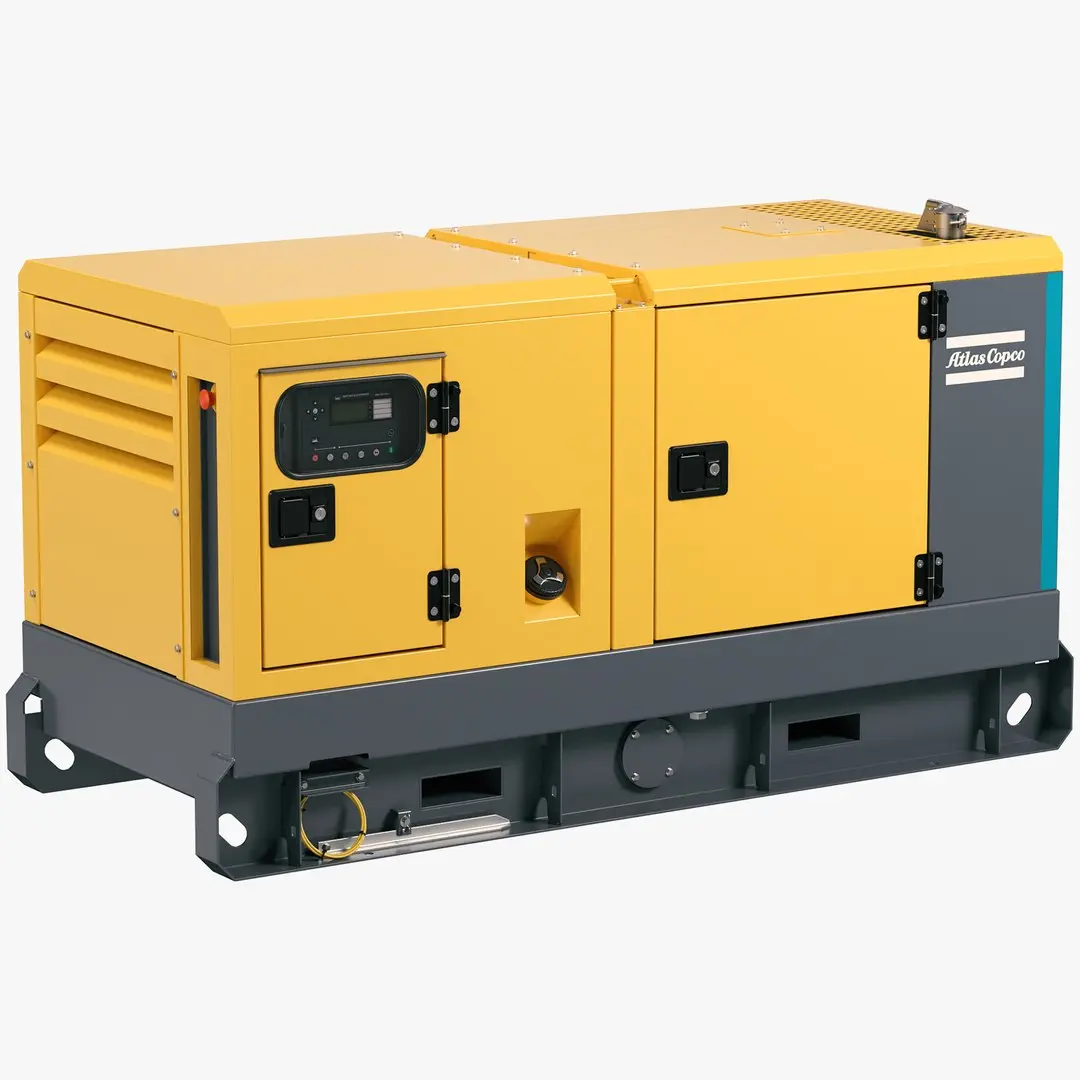 High-quality 3D model bundle featuring a range of Atlas Copco industrial equipment, including generators (QAS series), compressors, air dryers, energy storage systems (Zenergize), and nitrogen generators.
