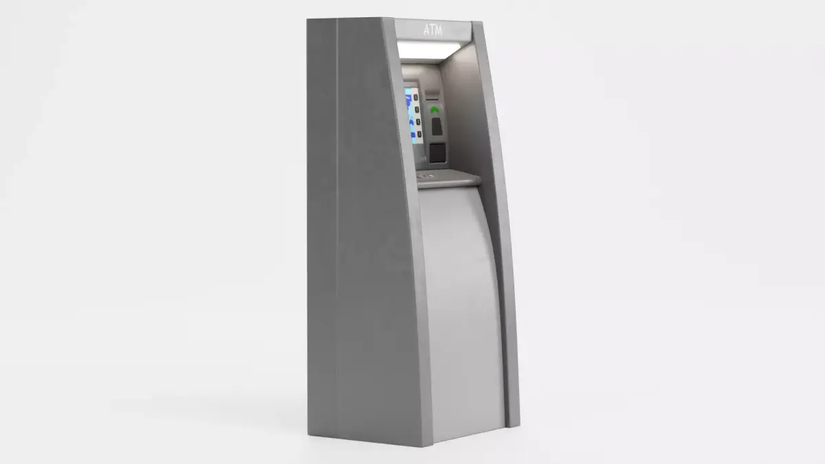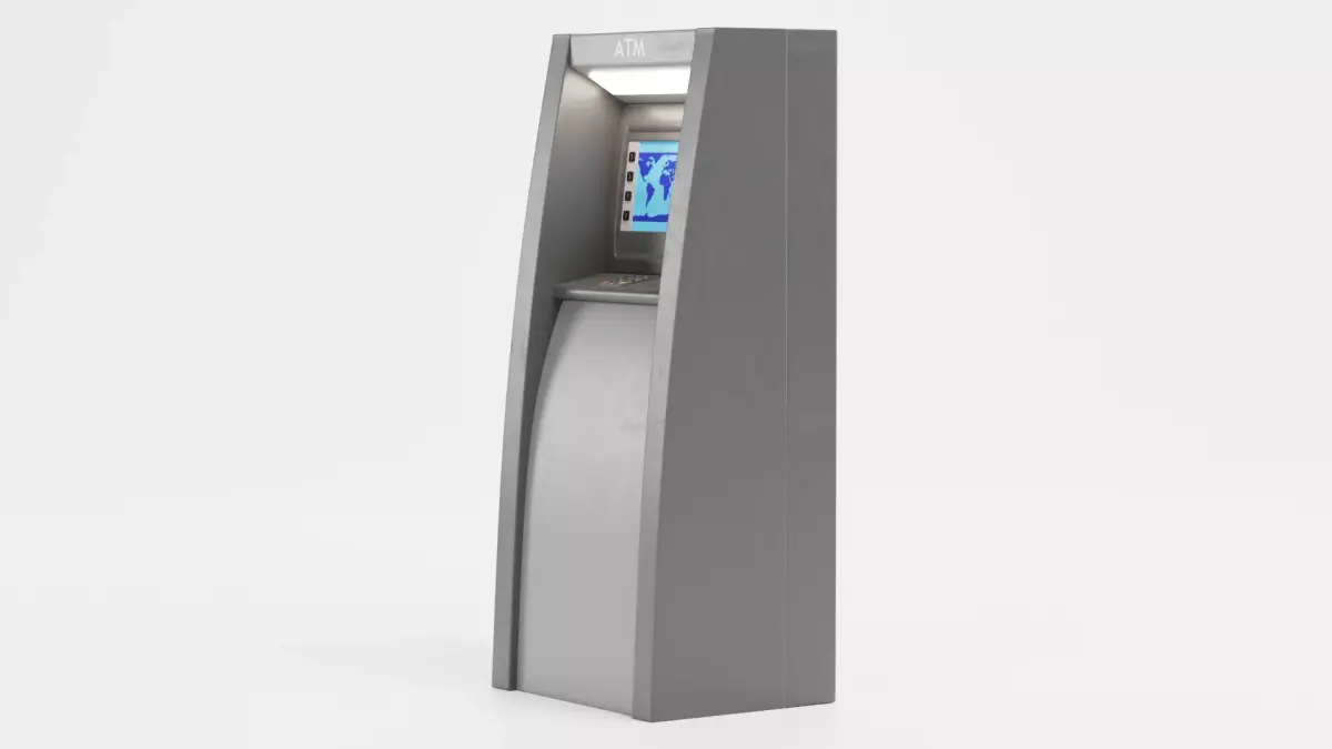 A realistic 3D model of a standalone ATM machine designed as a self-contained banking terminal with accurate proportions and functional details including screen, keypad, card reader, cash dispenser, and receipt slot. The model features a neutral, unbranded design and a brushed metallic surface with light wear, suitable for realistic or stylized visualizations.