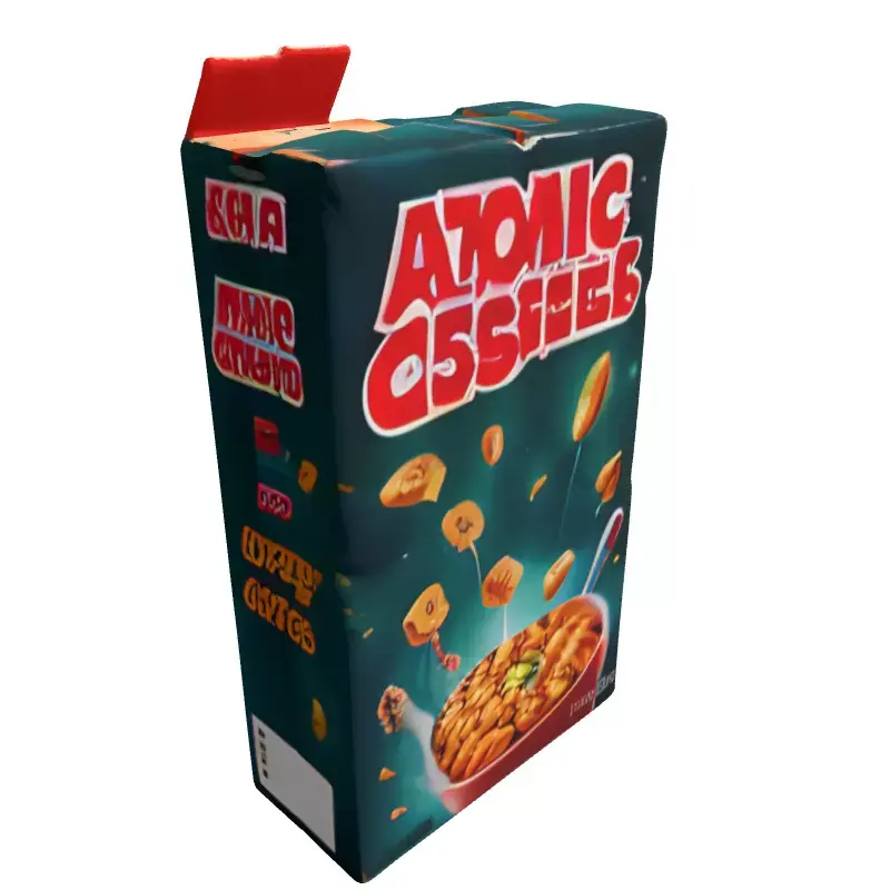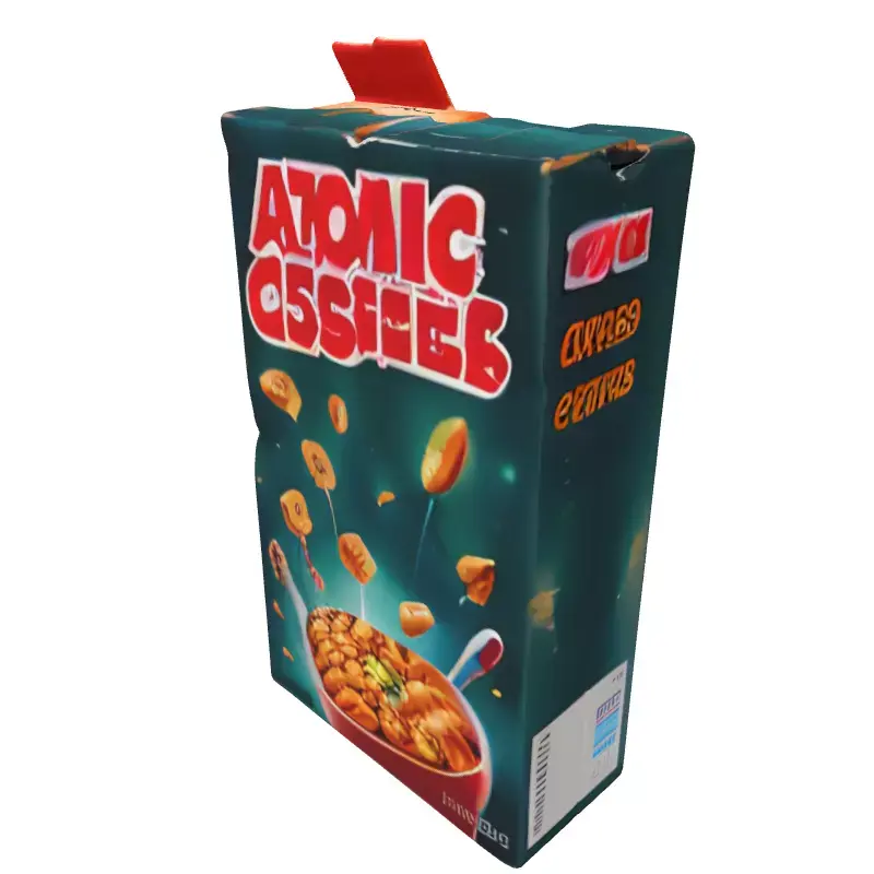 This highly detailed 3D model represents a vintage-inspired cereal box for 'Atomic Crispies', featuring a captivating retro sci-fi space theme. The design prominently displays a whimsical spaceship, numerous floating cereal pieces, and a vibrant red bowl, all set against a starry cosmic backdrop. This asset is an ideal prop for enriching a variety of digital environments, adding authentic detail to game levels and virtual reality experiences. It is perfectly suited for populating architectural visualization scenes, particularly those with a retro, modern, or slightly industrial interior design. The model serves as an excellent foreground or background element for kitchens, grocery store aisles, or futuristic household settings in film, animation, and digital art projects. Crafted with clean topology, this model is optimized for efficient rendering and smooth performance in interactive simulations and augmented reality (AR) applications. It comes fully UV unwrapped, allowing for easy application of textures and customization. Designed to support PBR (Physically Based Rendering) workflows, it guarantees realistic material interactions and visual fidelity under diverse lighting conditions. The model can be seamlessly integrated into popular game engines such as Unity and Unreal Engine, as well as various rendering software for high-quality static images. Supported file formats typically include GLB, OBJ, FBX, USD, and DAE, ensuring broad compatibility across major 3D software and platforms. The distinctive stylized art direction, with its nostalgic appeal and slight wear details, makes it a unique addition to any asset library. Whether you are building a quirky indie game, a realistic interior render, or a fun animated short, this Atomic Crispies cereal box adds a unique touch of charm and character. Its detailed design and robust optimization make it a versatile asset for both real-time and offline rendering needs.