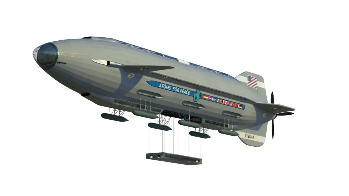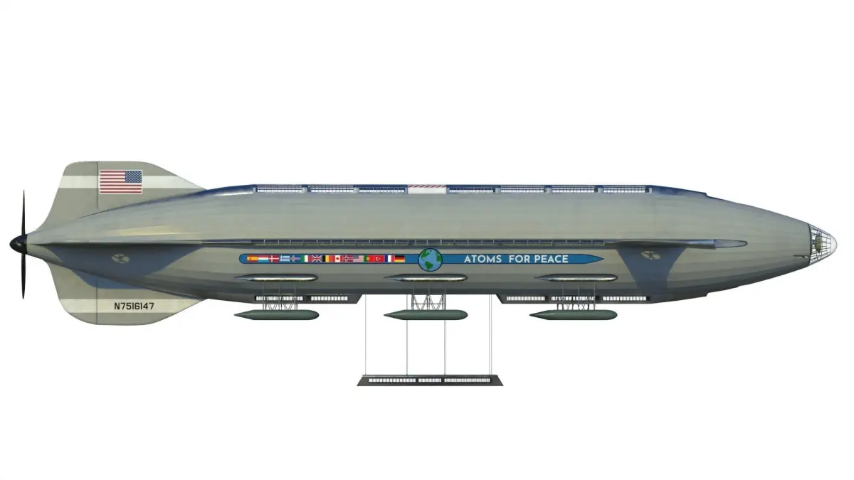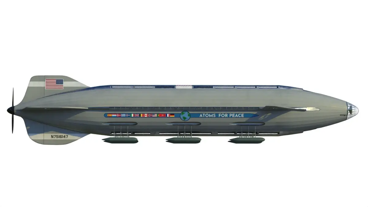 The American government developed the Atoms for Peace program in 1955. The aim was to promote the peaceful use of nuclear power. As a contribution to this project, comic-strip artist and illustrator Frank Tinsley published his version of a nuclear-powered passenger airship in Mechanix Illustrated, a magazine for hobby mechanics. Tinsley's illustrations also found their way into specialist literature. The government remained sceptical and finally decided to build the civilian nuclear freighter Savannah.