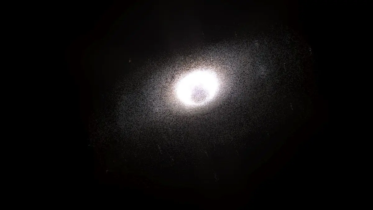 Model is a set of particle systems with elements of different types. Since real Atoms For Peace Galaxy contains hundreds of billions stars, there are no way of simulate realistic view of galaxy directly. So here used textured particles with complex materials, placed along structural parts of Galaxy. Some of them are “clouds” of stars, others are light absorbing dust, emitting hydrogenous clouds, individual super-giant stars, etc. Multi-layered complex shaders was specifically designed to retain detailed and realistic view with extreme closeup and inside-the-galaxy views