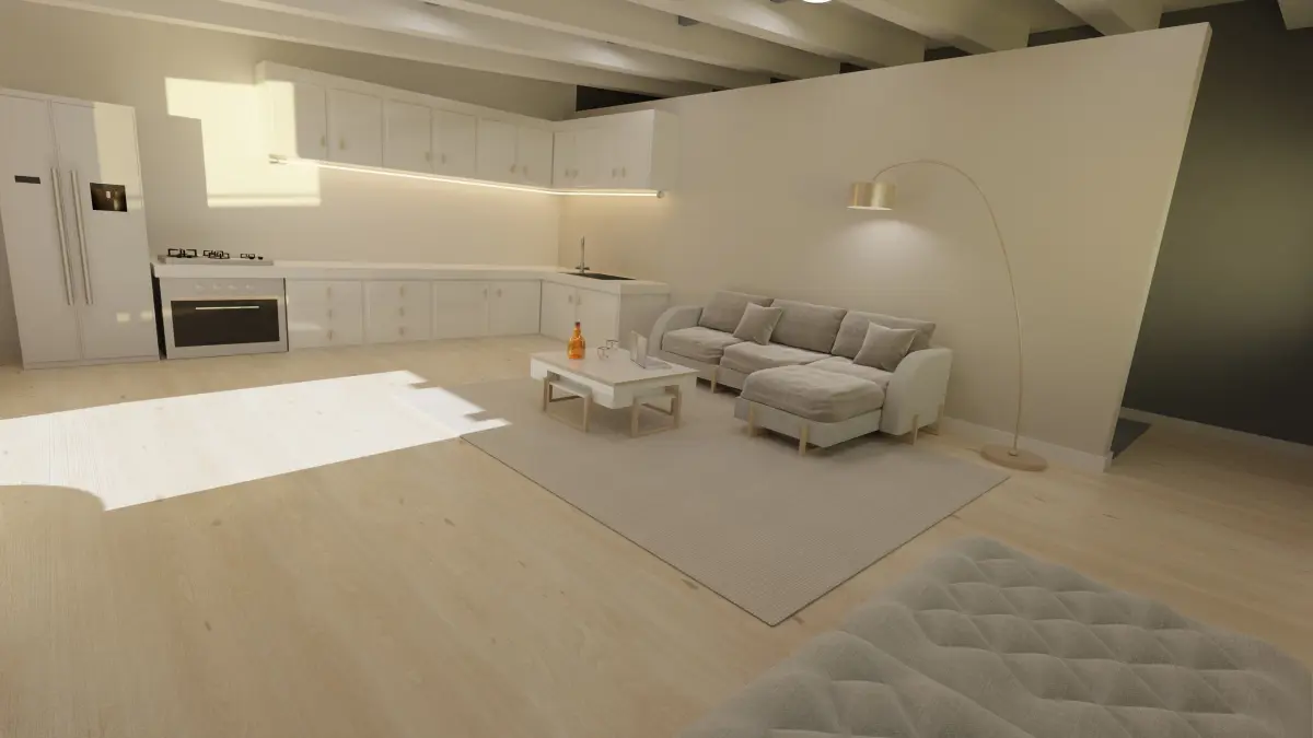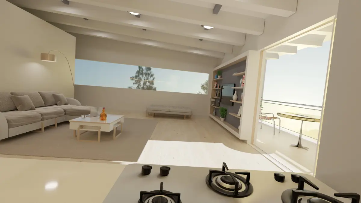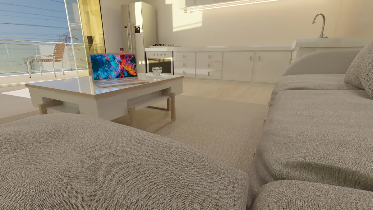 This scene was done in Blender 3.2 and renders are taken in Cycles Render Engine. Penthouse Living room, kitchen and balcony design.