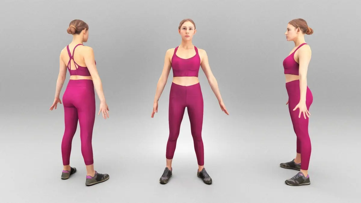 This is a true human size detailed model of a beautiful young woman of Caucasian appearance dressed in sportswear. The model is captured in the A-pose with mesh ready for rigging and animation in all most usable 3d software.