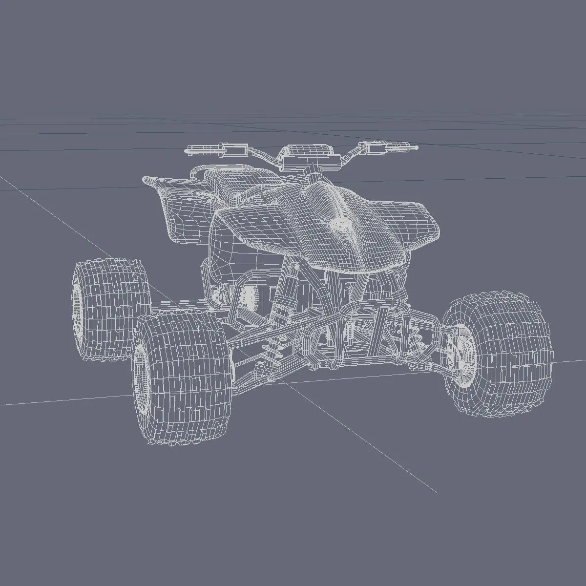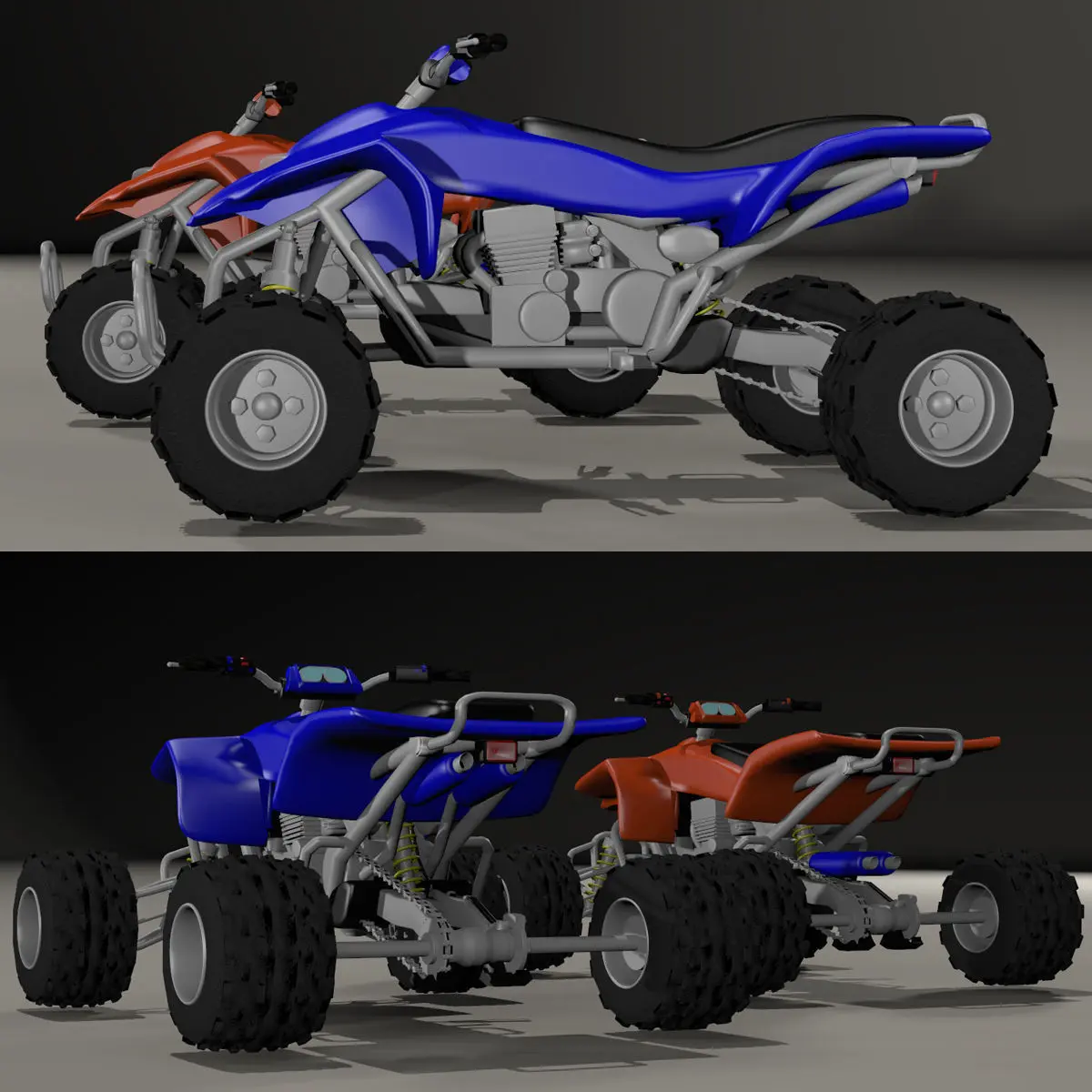 All terrain vehicle. Includes 2 slightly different Quad versions, texture maps and .jpg texture images for the rubber and leather parts and for the radiator.