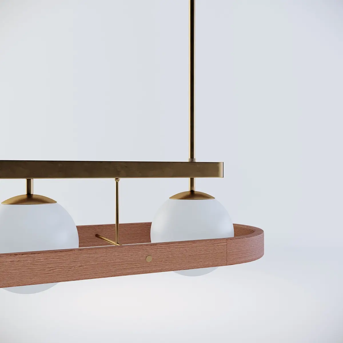 Descending into three glass orbs with a solid oak frame, the hanging light casts a soft, diffuse light overhead and references the vintage-inspired lighting seen throughout 180 House on London's Strand.