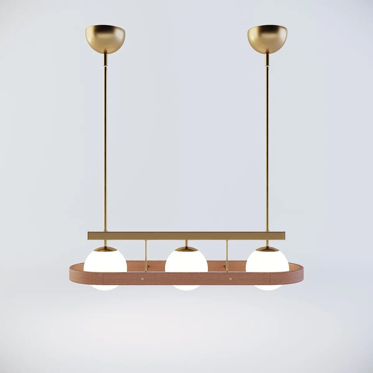 • Chandelier with three glass orbs• Wrap around solid oak frame• Antique brass finish• Adjustable pole kit included