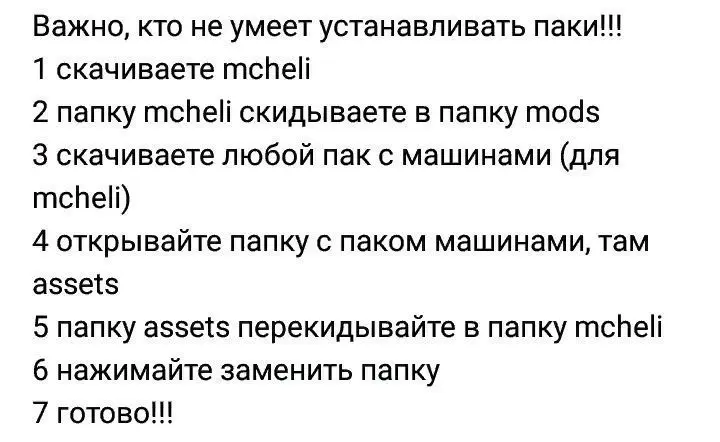 Audi 2012 для мода mcheli minecraft 1.7.10В архиве присутствует:1)модель (mqo)2)конфиг (txt)3)текстура (png)4)иконка (png)Описание:1)модель без багов2)персонализированная иконка3)персонализированная текстура4)крутятся и поворачиваются колесаУстановка:Модель: AppData\Roaming.minecraft\mods\mcheli\assets\mcheli\models\tanksКонфиг: AppData\Roaming.minecraft\mods\mcheli\assets\mcheli\tanksТекстура: AppData\Roaming.minecraft\mods\mcheli\assets\mcheli\textures\tanksИконка: AppData\Roaming.minecraft\mods\mcheli\assets\mcheli\textures\itemsСвязь с продавцом: https://vk.com/mchelinuckemcarsГруппа: https://vk.com/mcheli2021