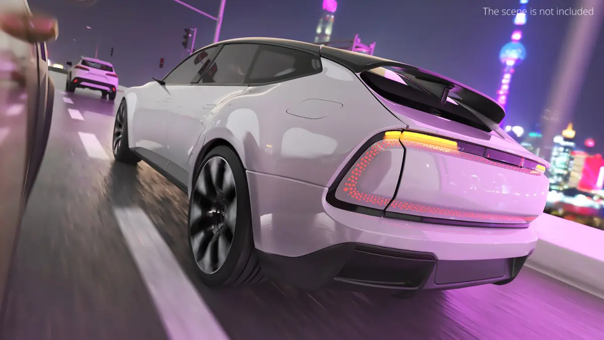 This model features a modern aerodynamic design, characterized by smooth contours and cutting-edge technology. The detailed exterior includes distinctive LED lighting, large alloy wheels, and a spacious cabin. The design integrates sustainability with style, providing an innovative look into the future of mobility.