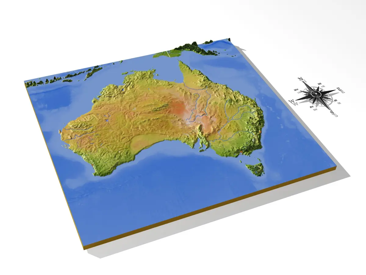 The set contains three models: a relief map of Australia with surrounding area, a separate relief cutout of the state area, and a separate plain cutoutof the state outline.