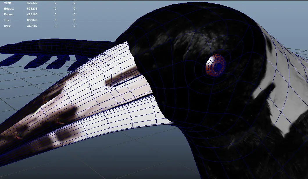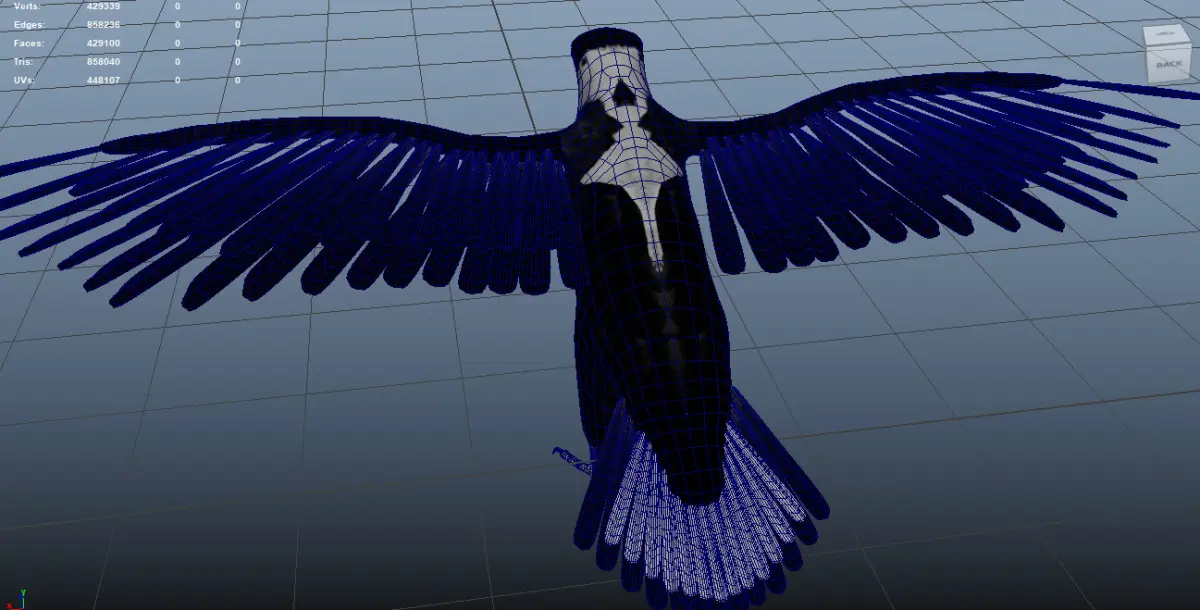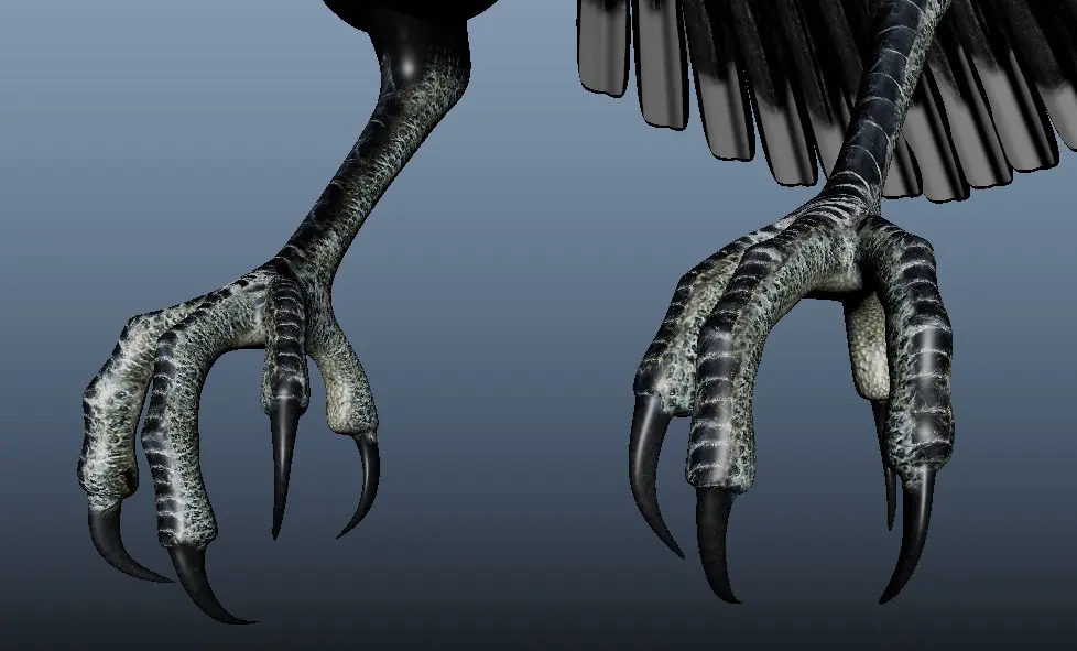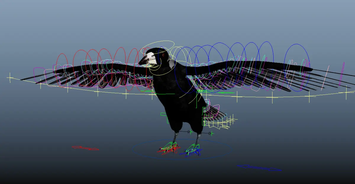 Rigged with Maya's Advanced Skeleton, includes custom controls for wing fold, claws, tail feathers, beak. Feathers can be repositioned manually alongside the group controls. Also has Delta Mush deformer to smooth out deformations.