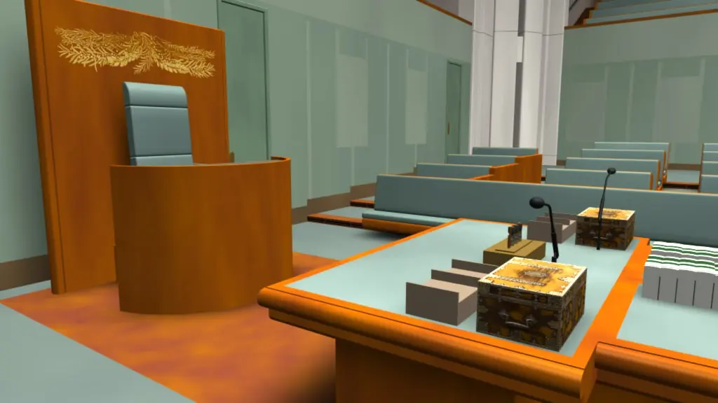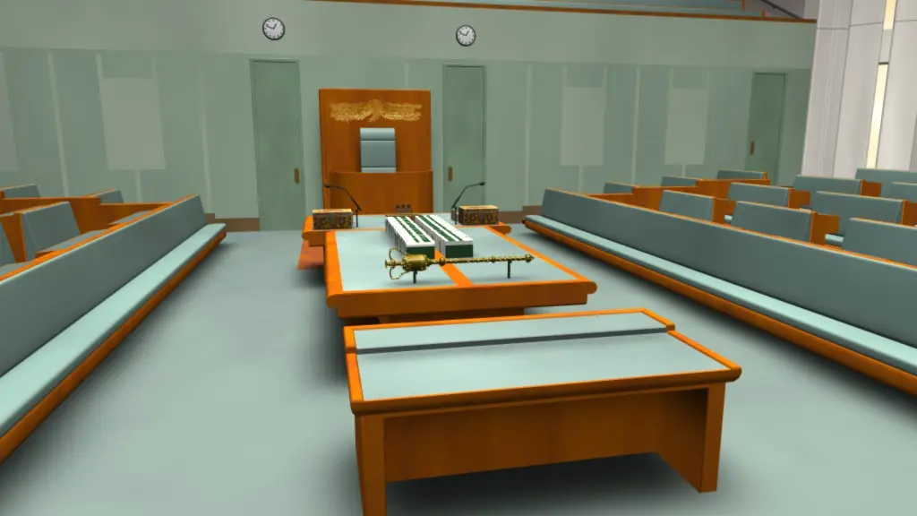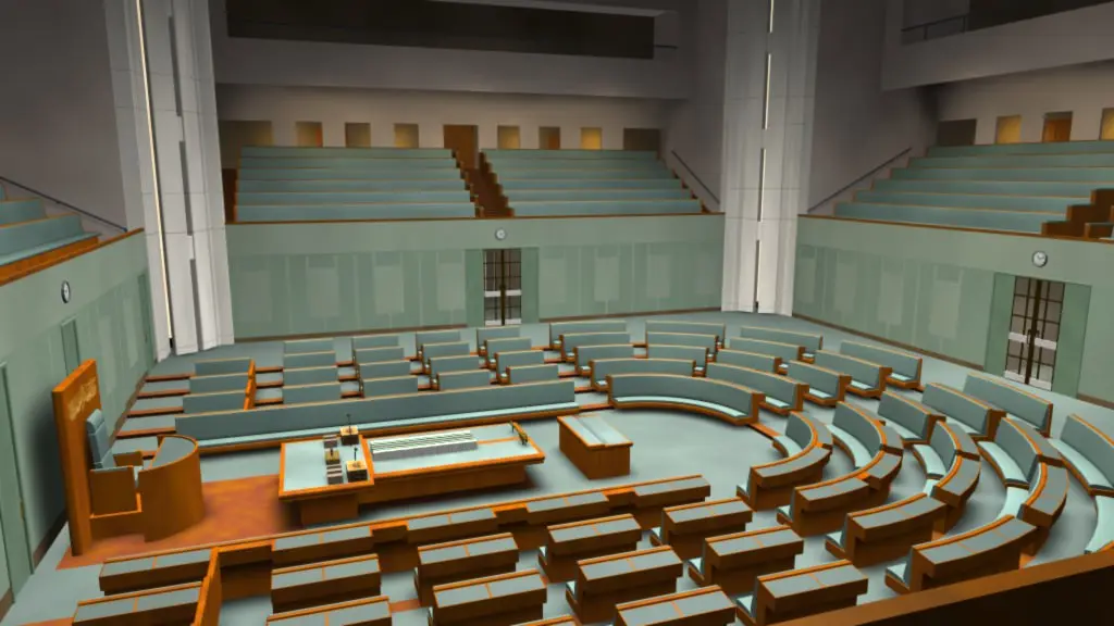 House of Representatives – Parliament of Australia. Uses textures in the diffuse surface channel to create ground shadows, which saves on render times. Note the ceiling is not modeled.